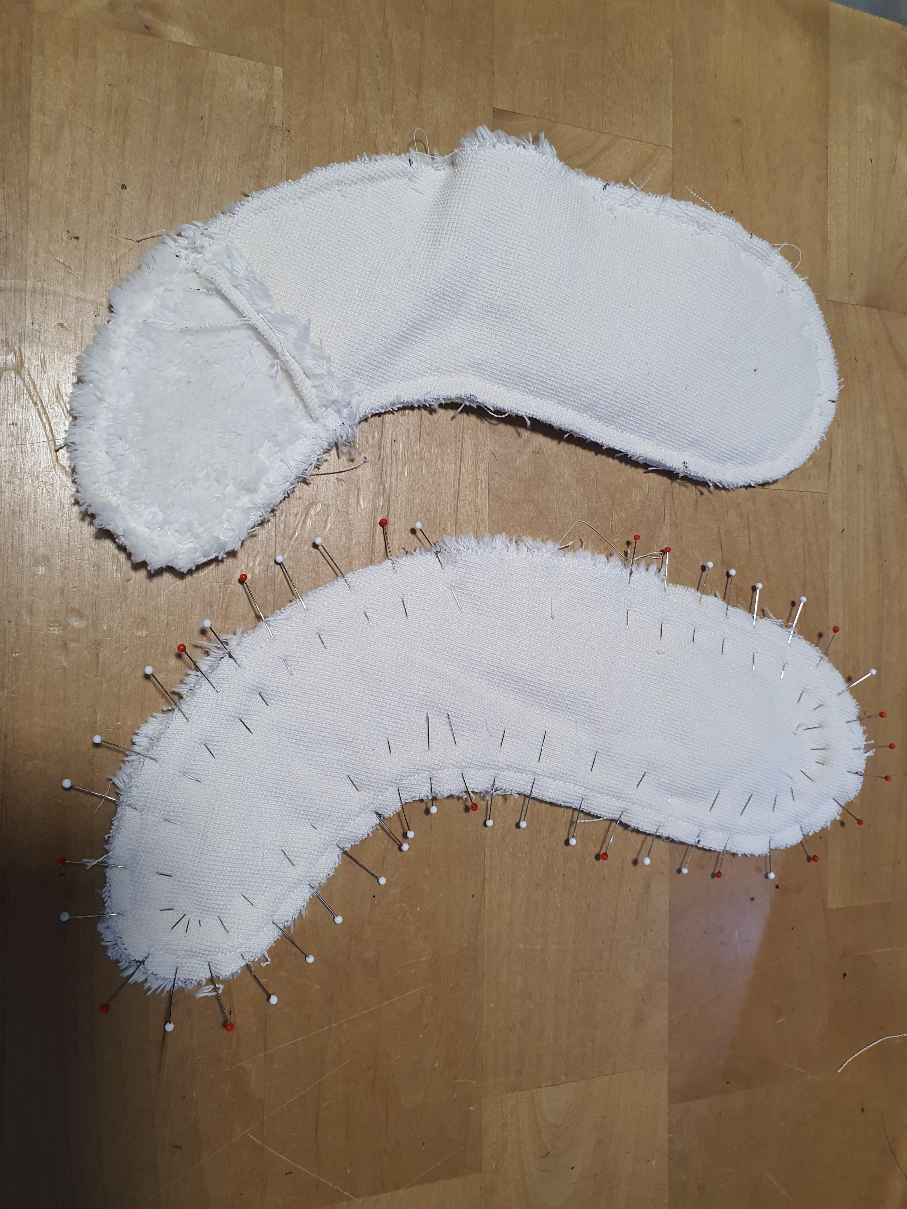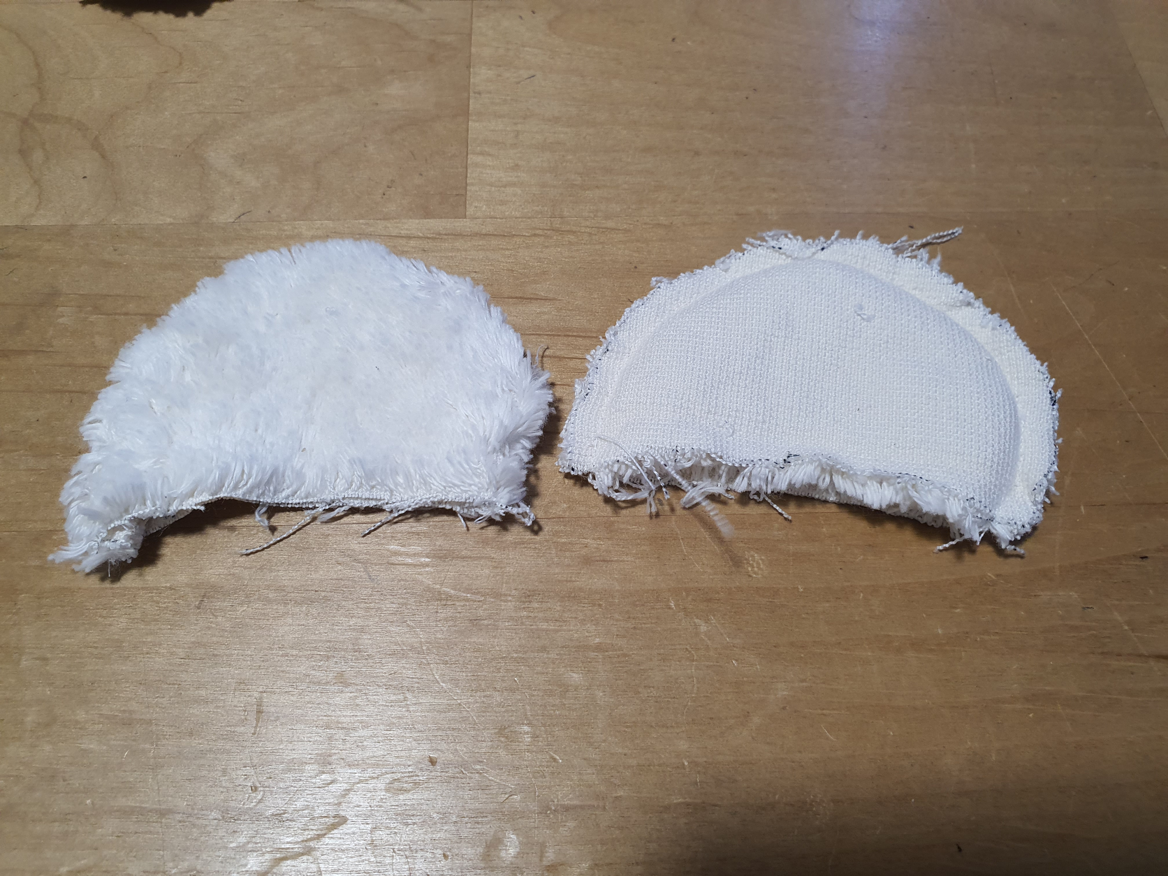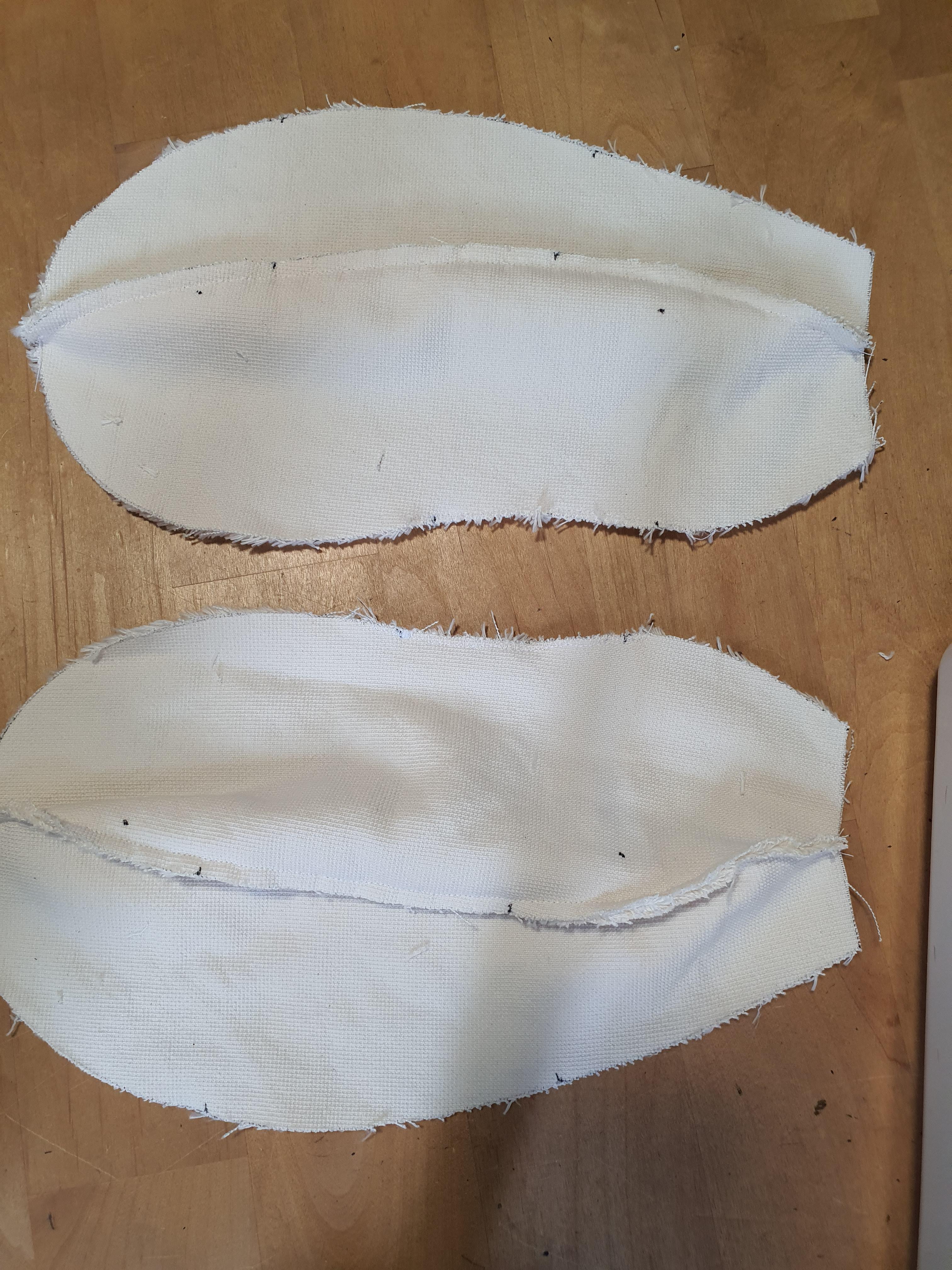 귀 원단을 대칭으로 포개어 놓고 곡선 부분만 바느질 한 후 뒤집어 줍니다.