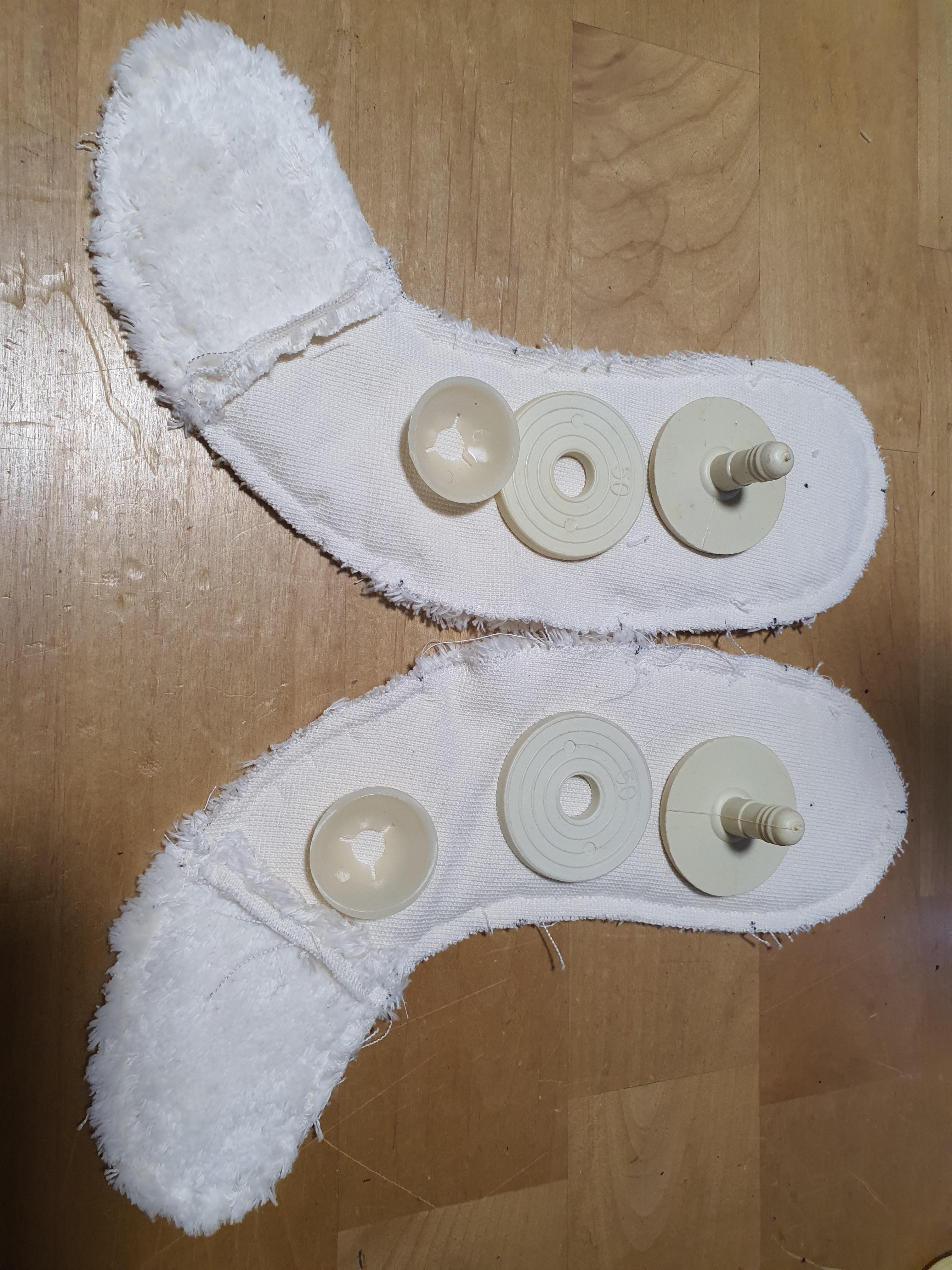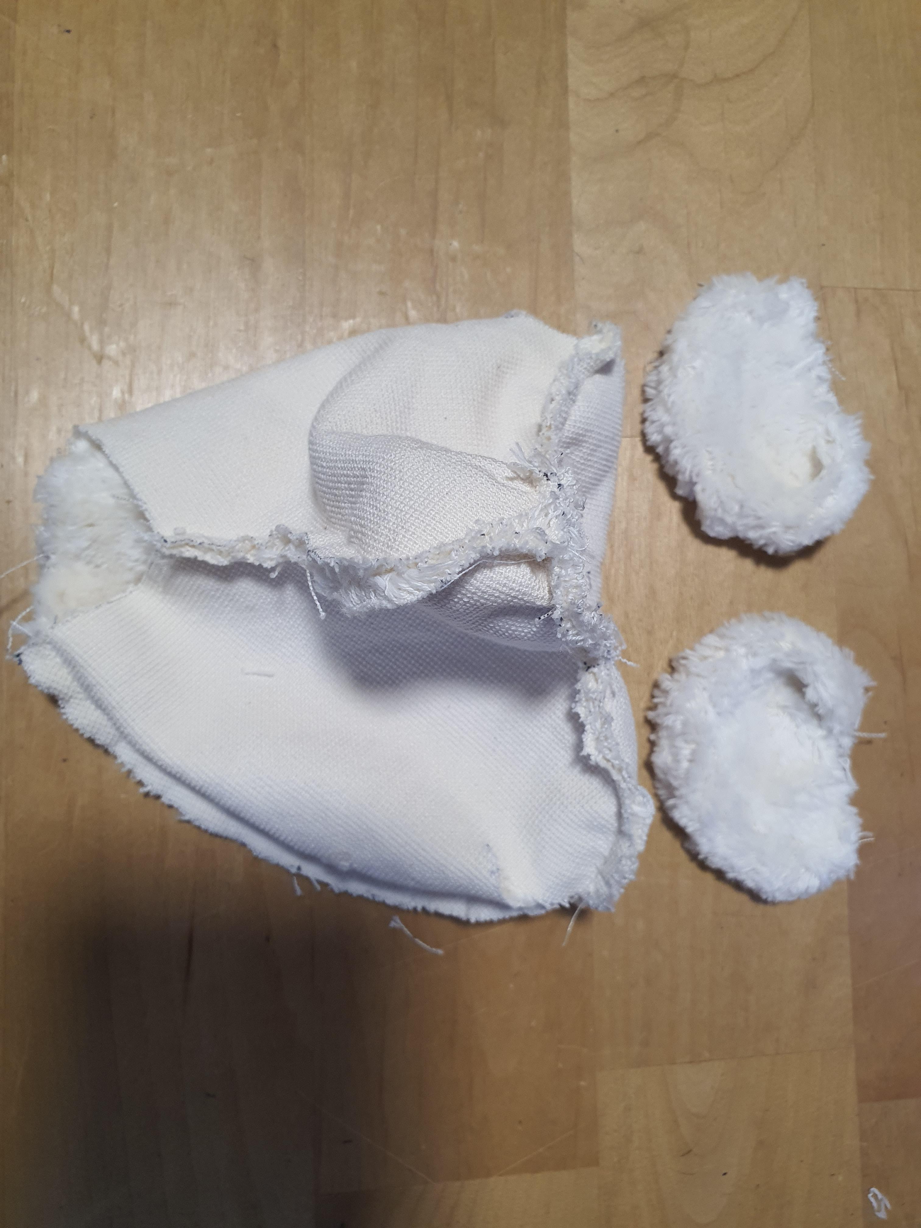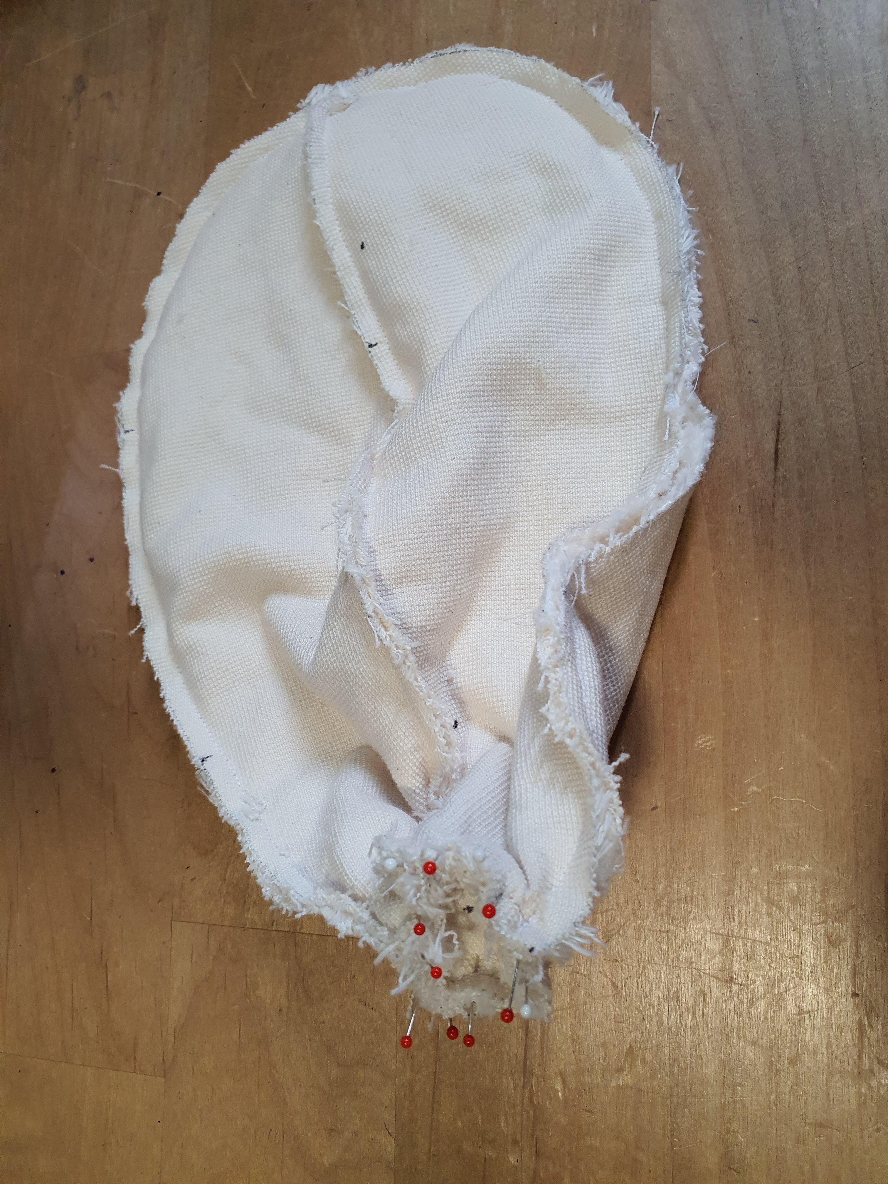 귀 위치에 귀를 끼워 넣은 후 얼굴에 고정시켜 줍니다. 이때 귀 접힌 부분이 마주 보도록, 접힌 귀는 앞얼굴 쪽으로 끼워넣고 바느질 해야 합니다.