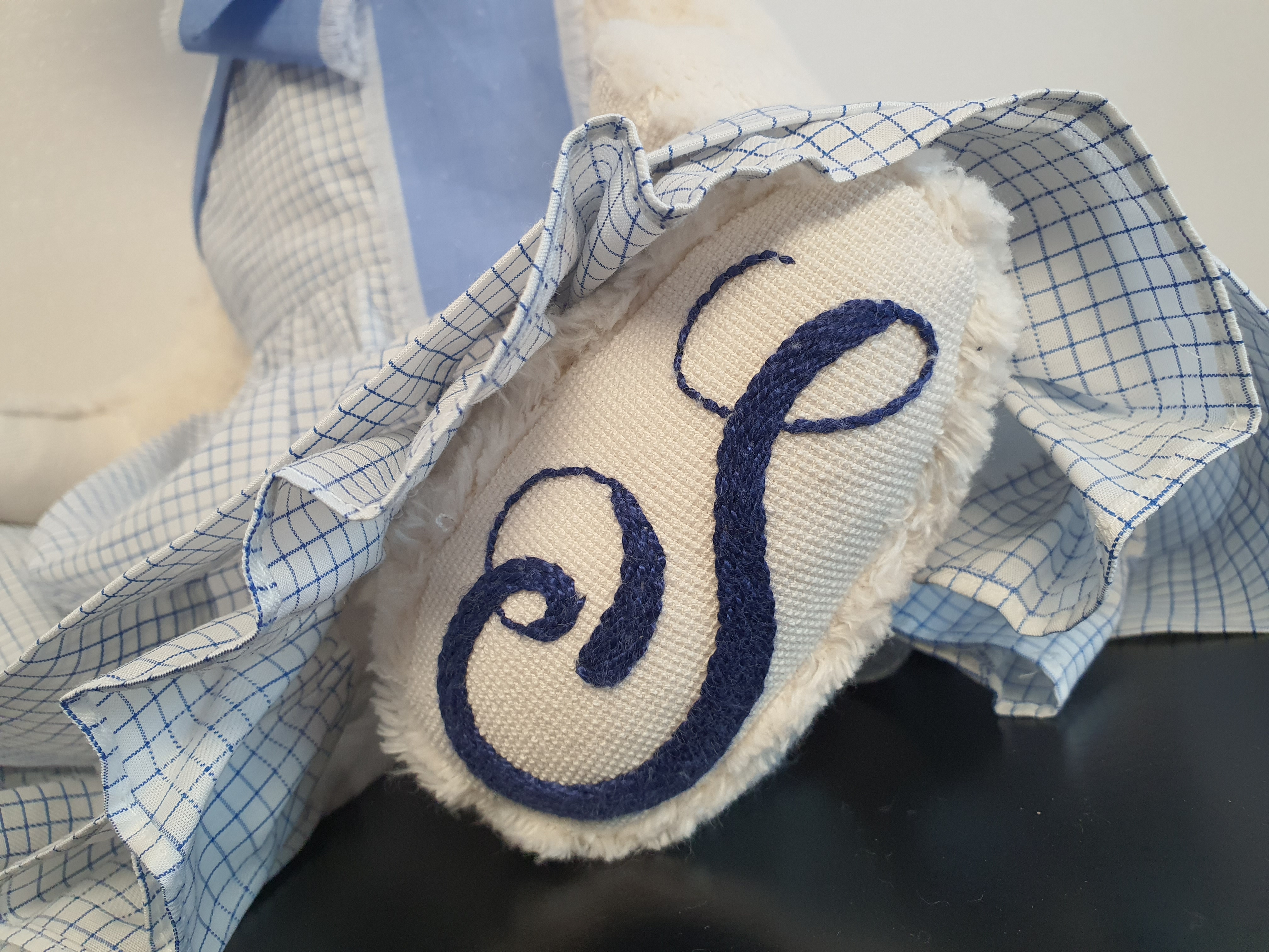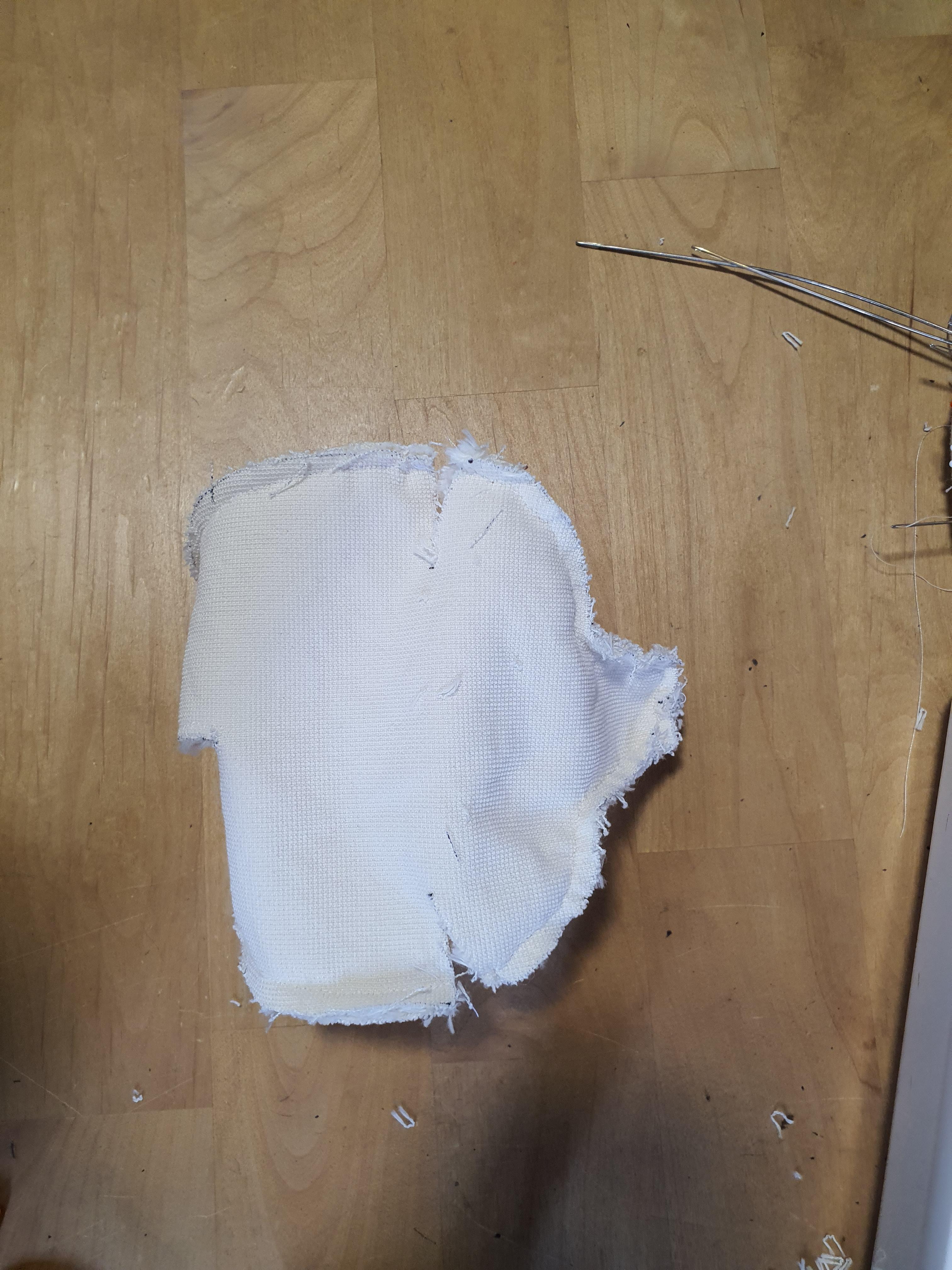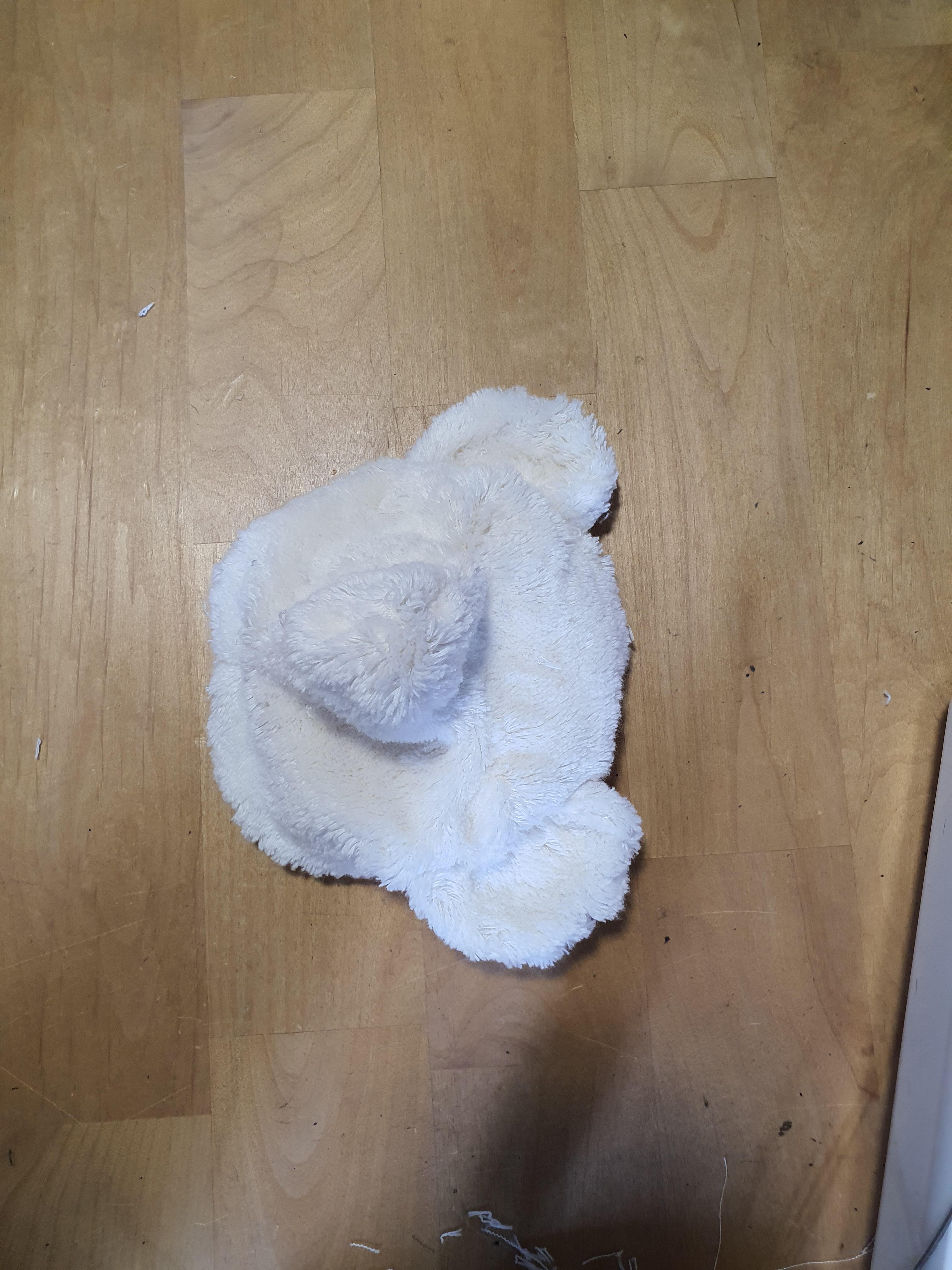 귀 위치에 귀를 끼워 넣은 후 얼굴에 고정시켜 줍니다. 이때 귀 접힌 부분이 마주 보도록, 접힌 귀는 앞얼굴 쪽으로 끼워넣고 바느질 해야 합니다.