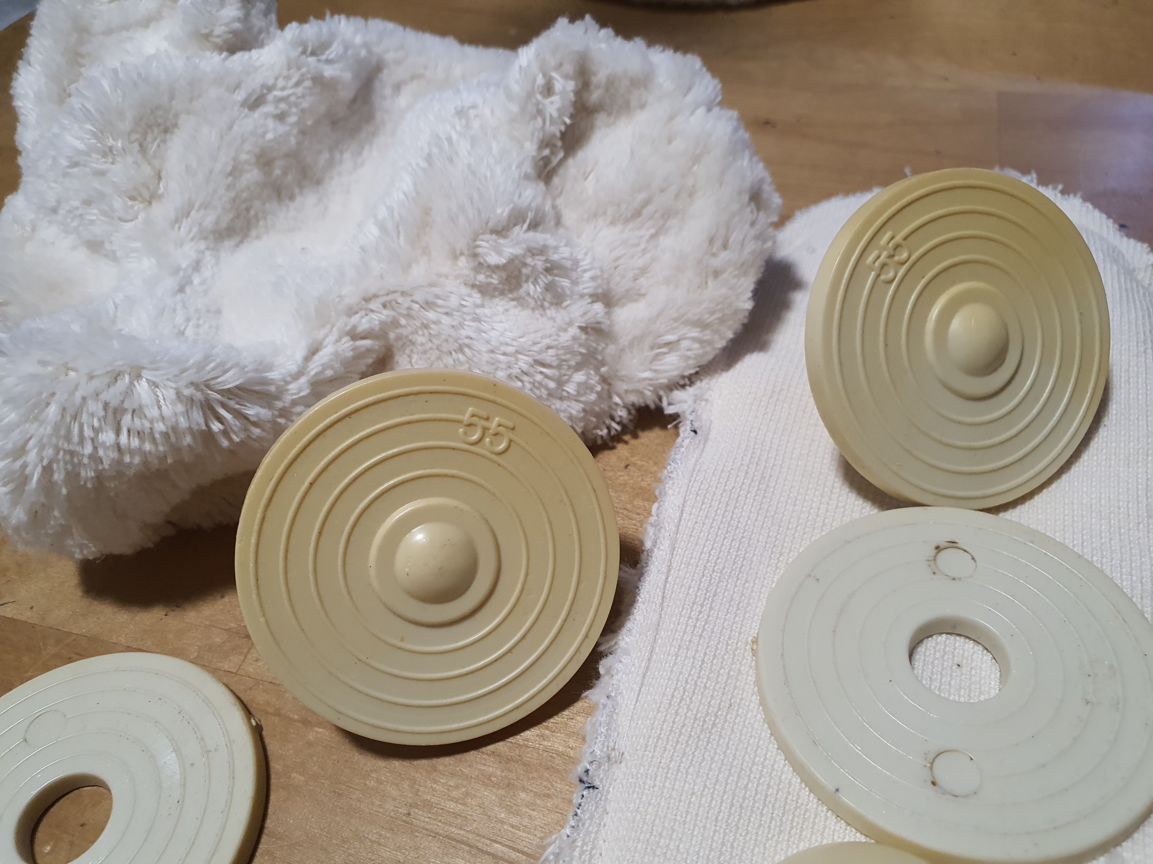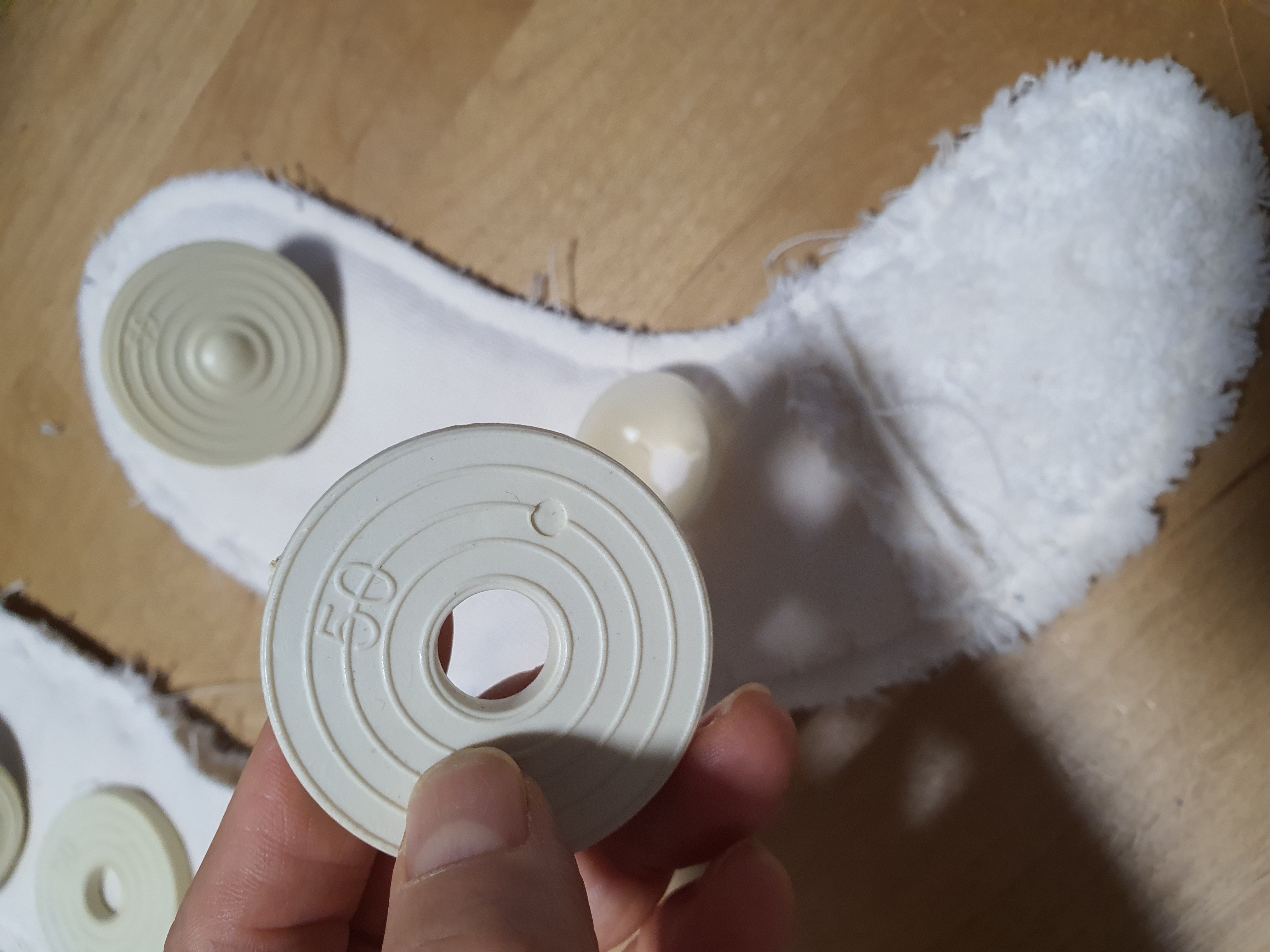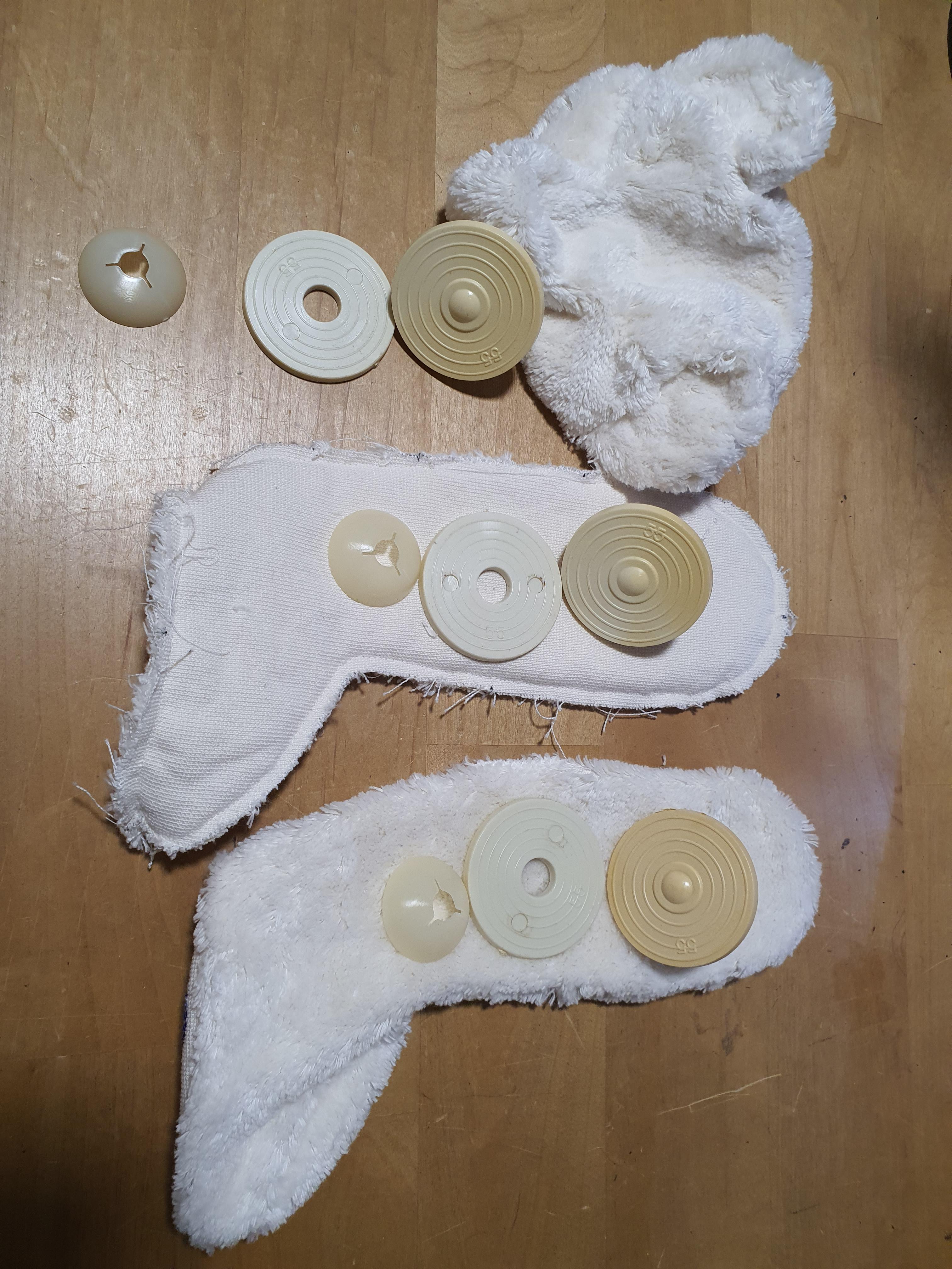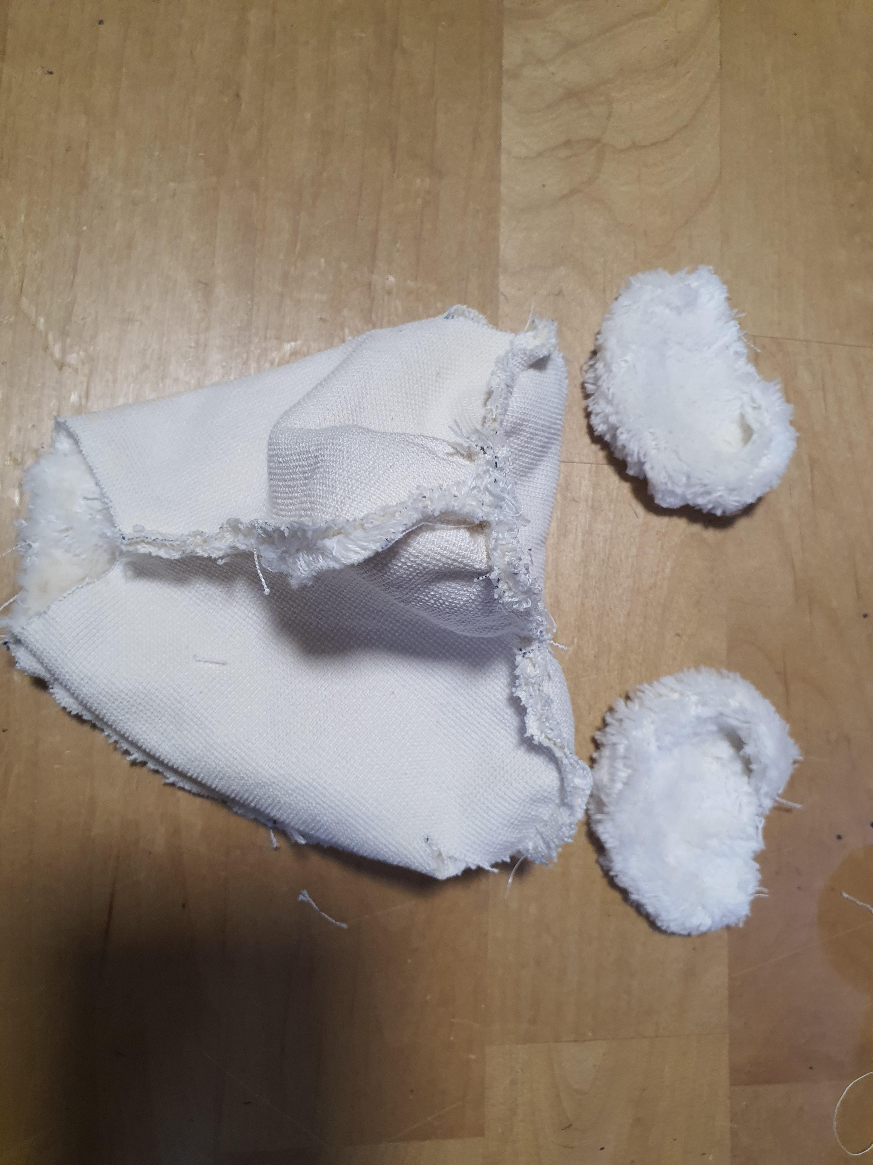 손바닥은 털을 깎아서 쓰거나 뒤집어서 털이 없는 부분을 써주세요. 어울리는 배색 원단을 사용하셔도 됩니다. 안쪽팔 원단에 손바닥을 연결해 줍니다.