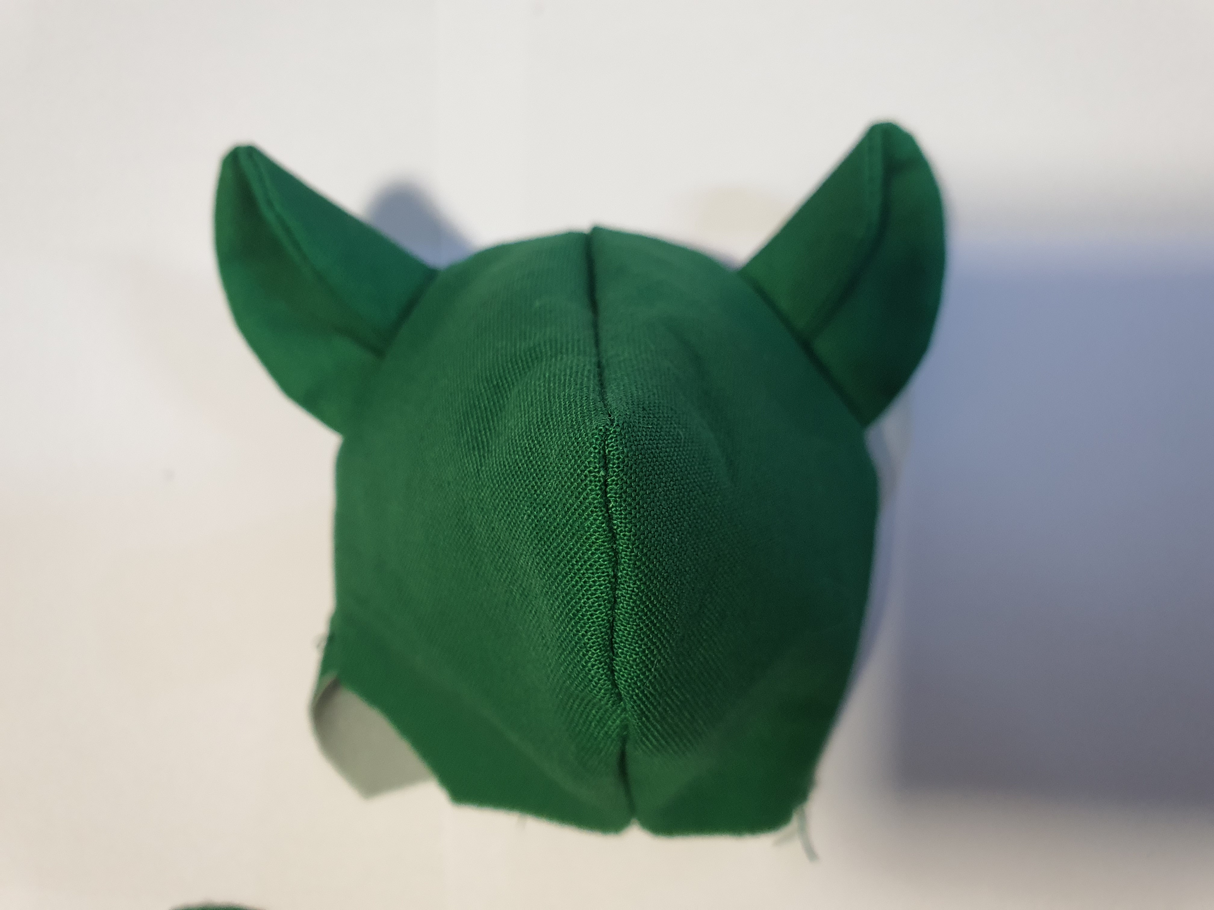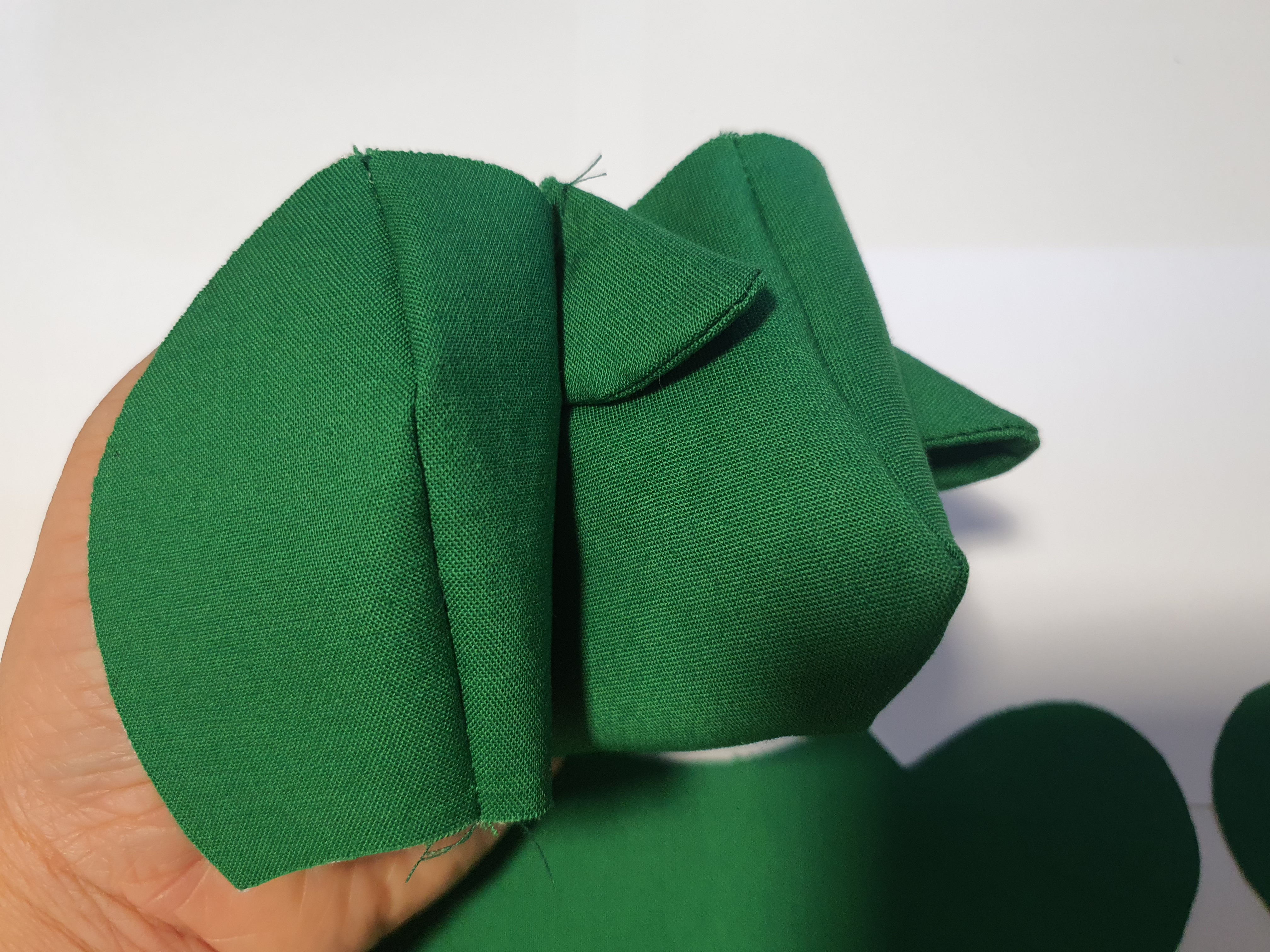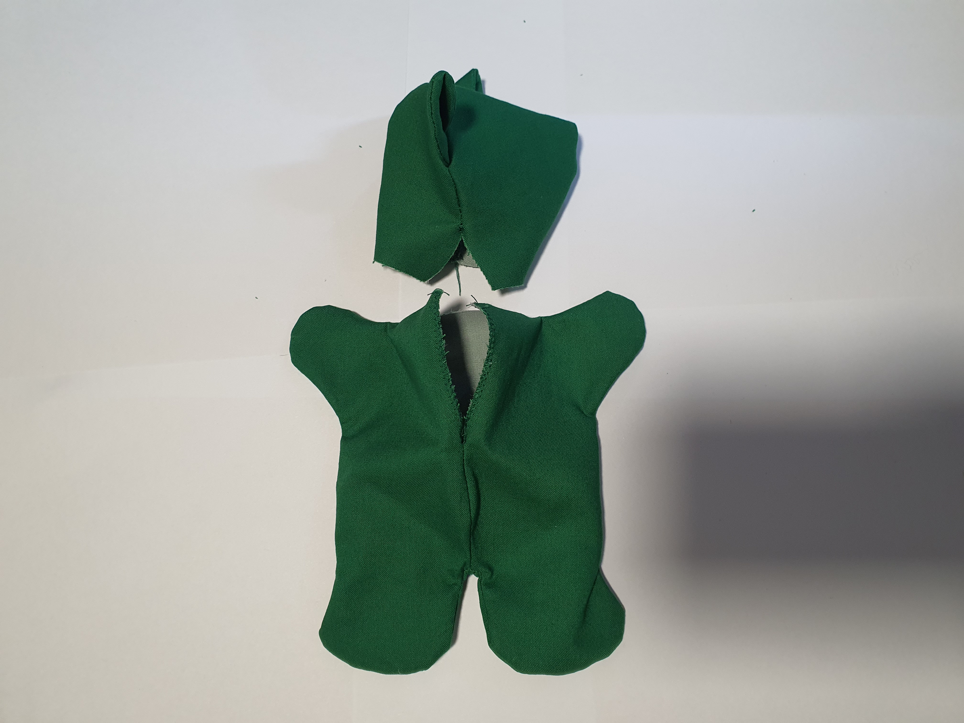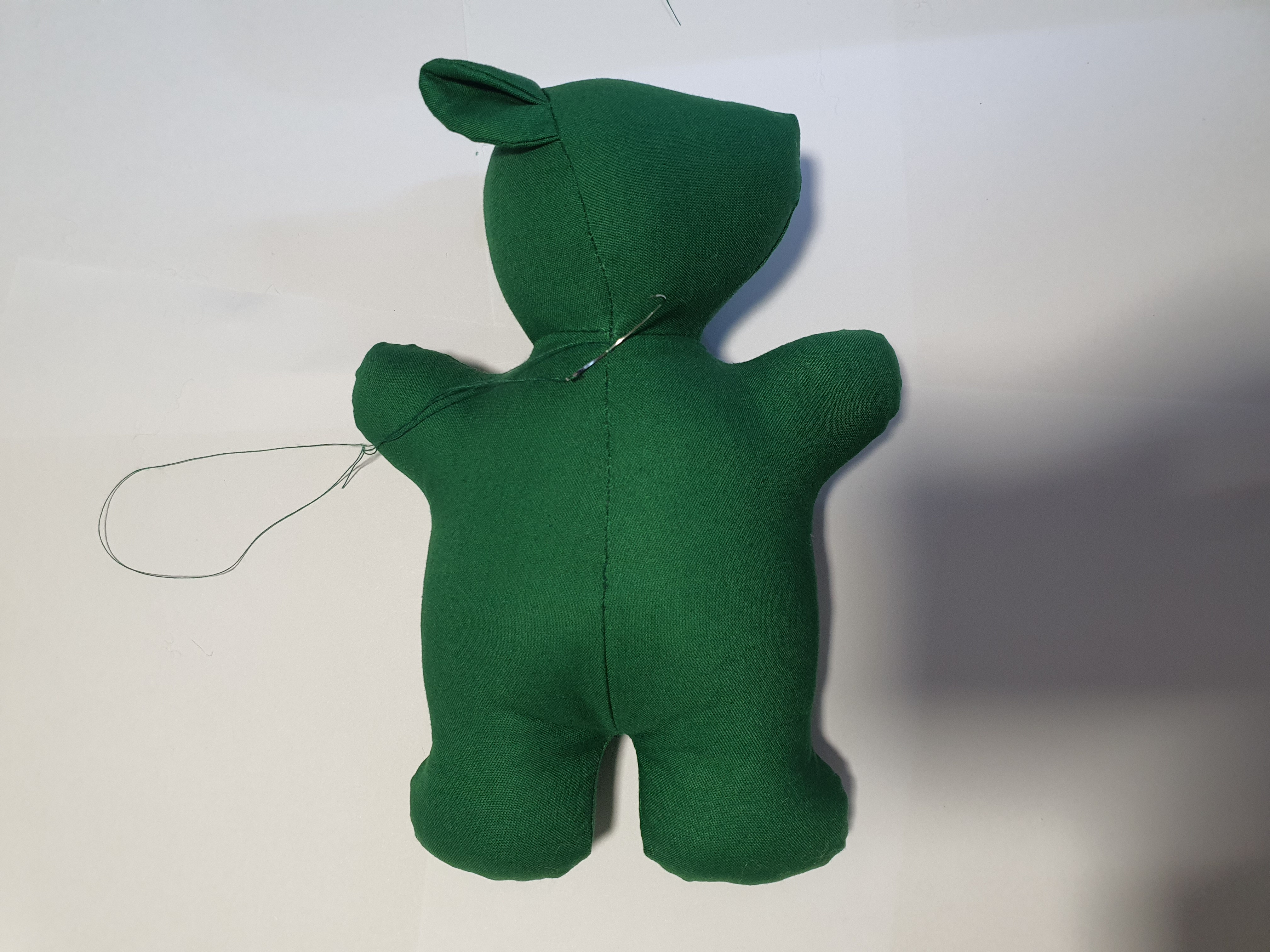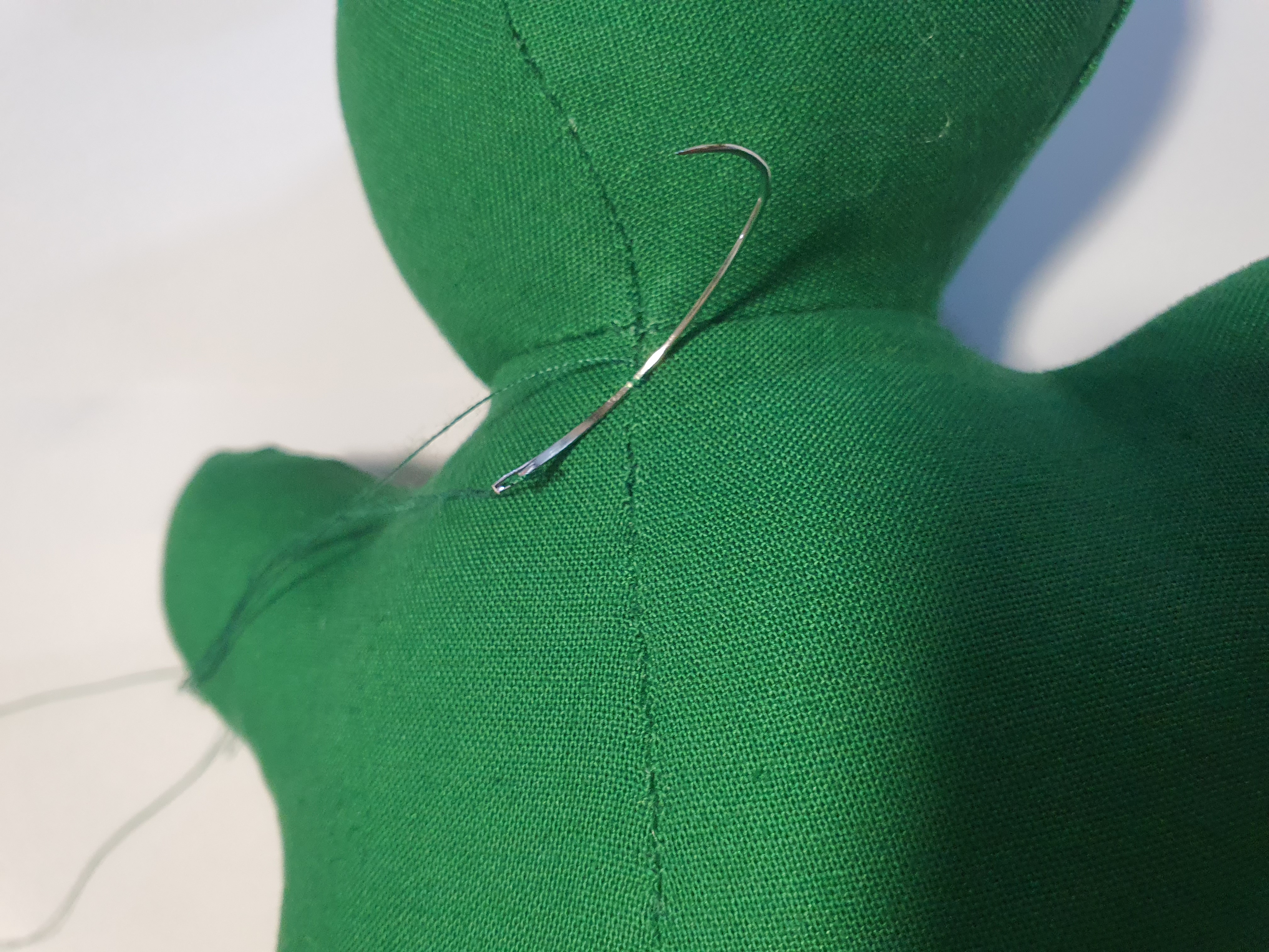 접힌귀가 앞에서 보이도록 끼워 넣고 얼굴 앞 뒤를 바느질 해서 머리를 완성 합니다.