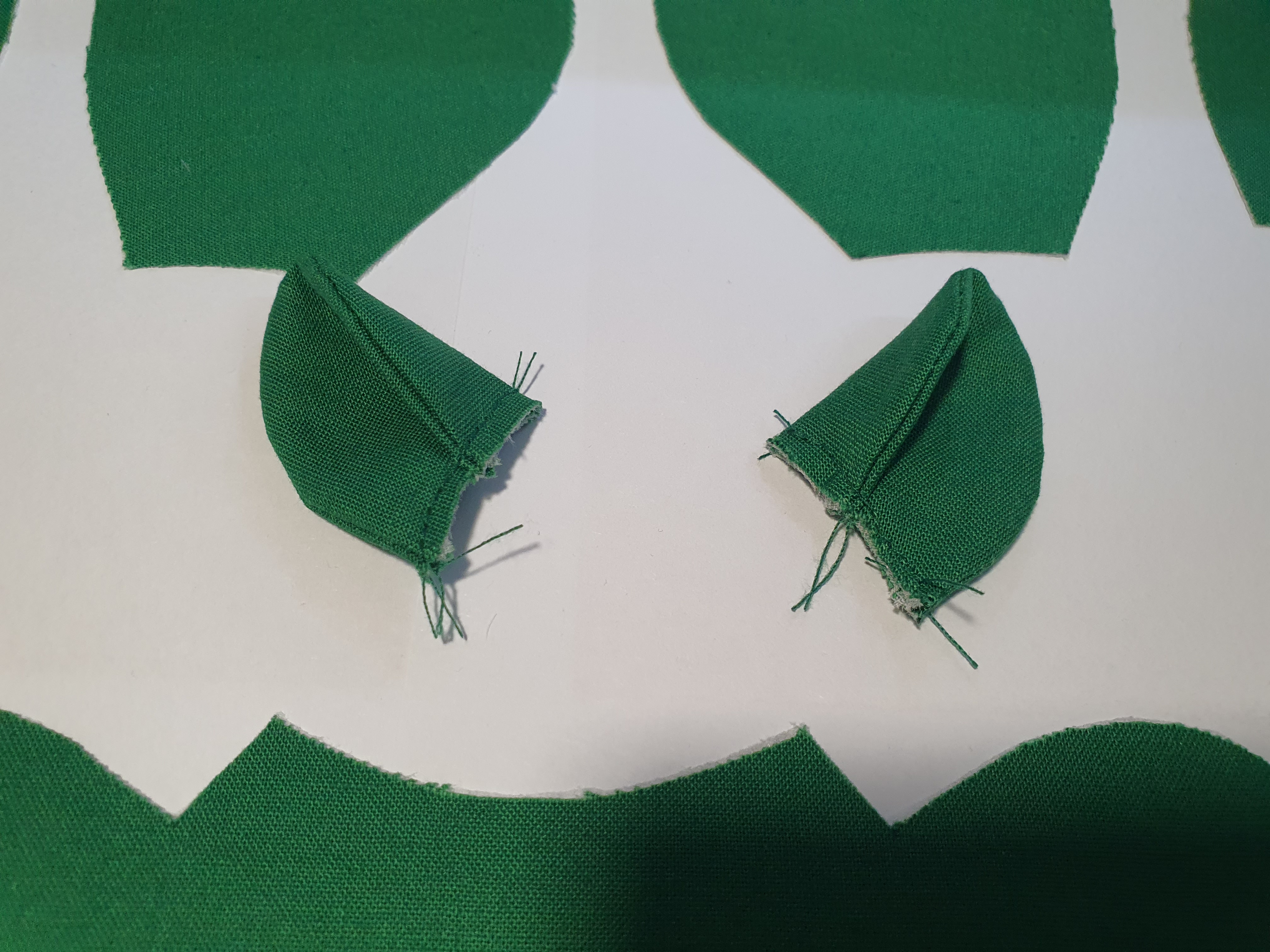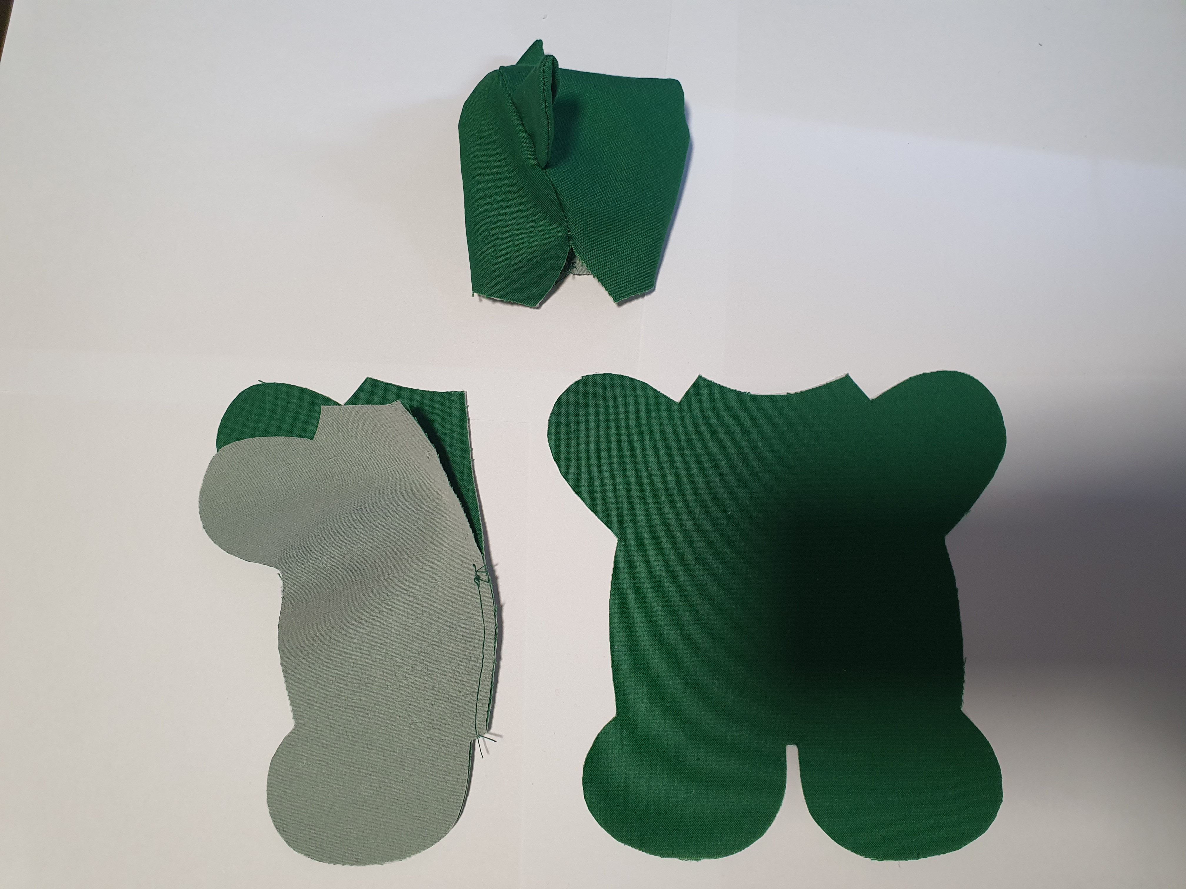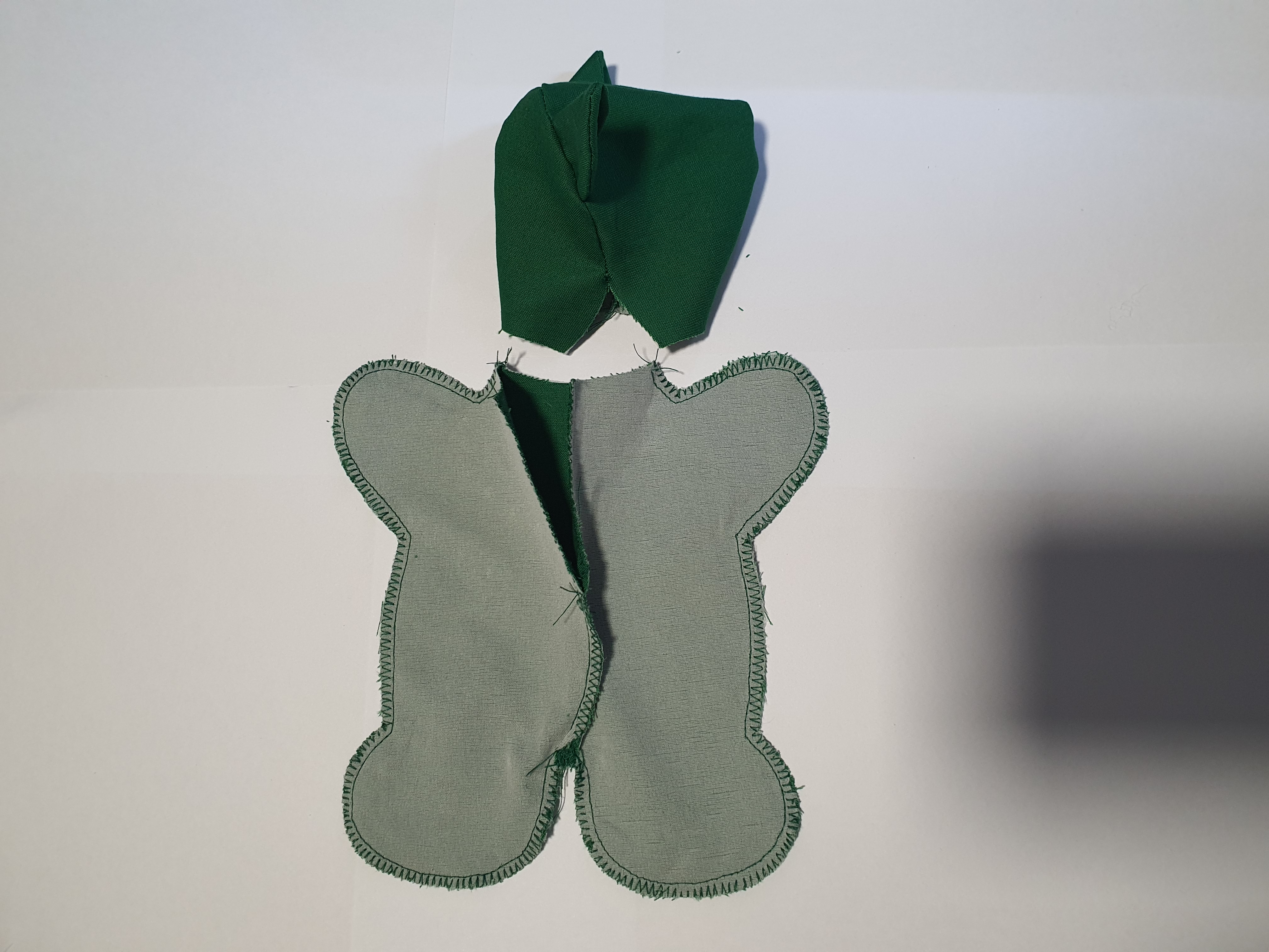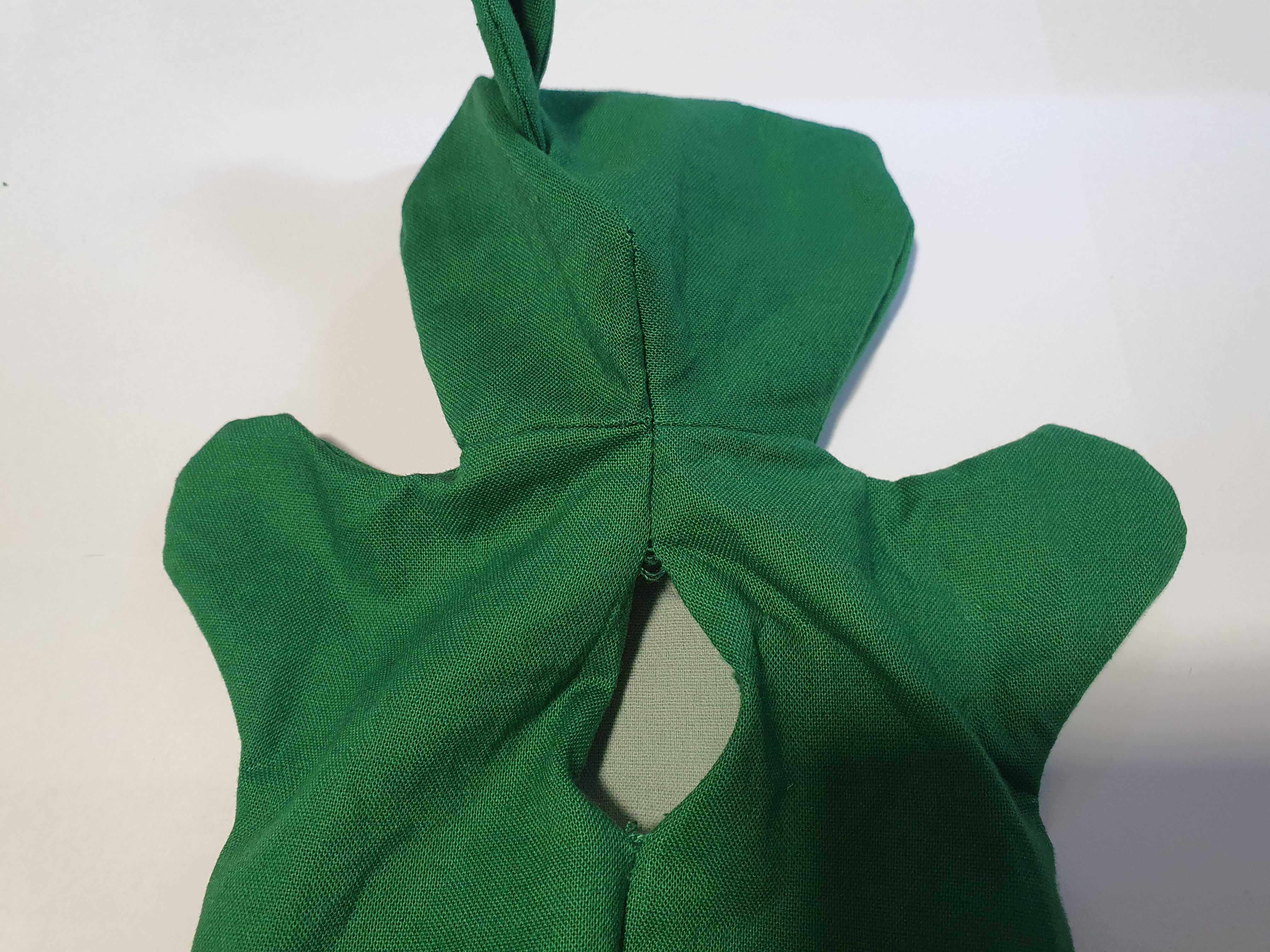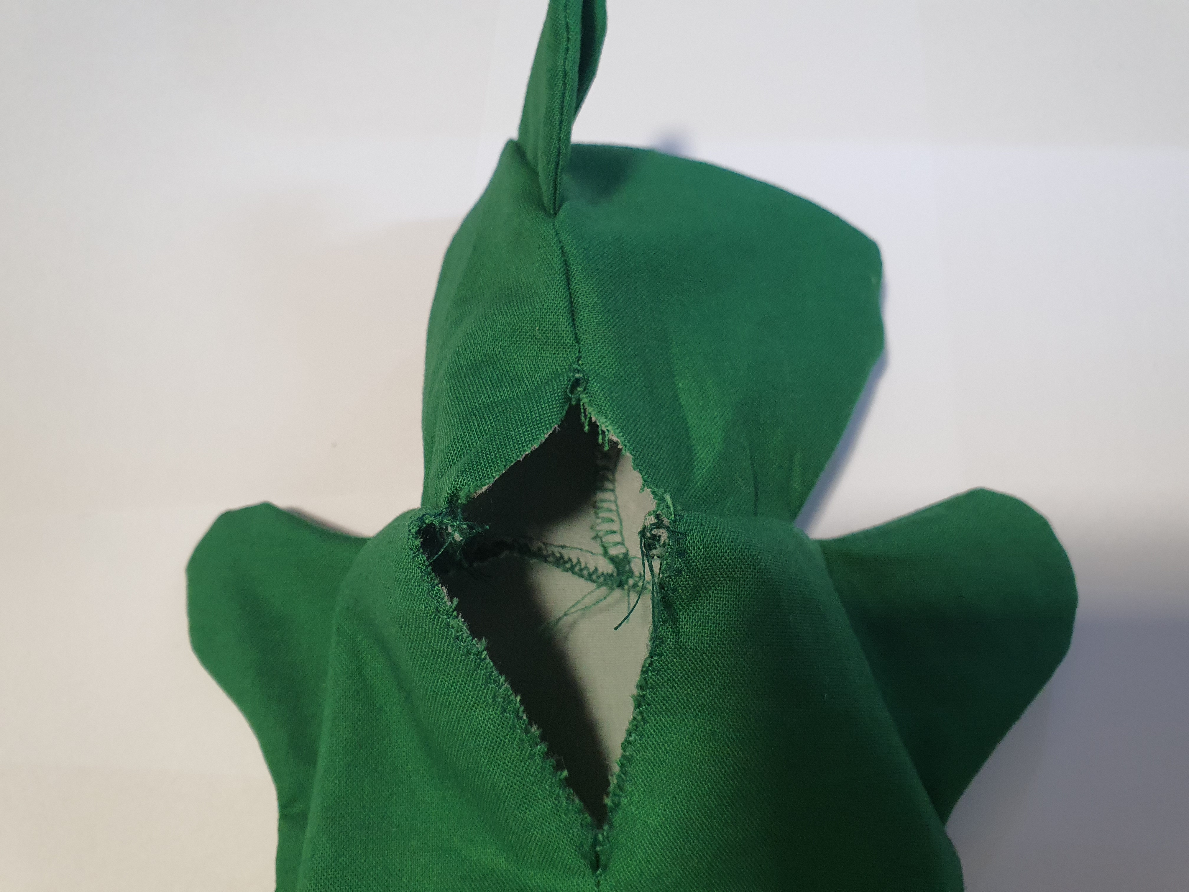접힌귀가 앞에서 보이도록 끼워 넣고 얼굴 앞 뒤를 바느질 해서 머리를 완성 합니다.