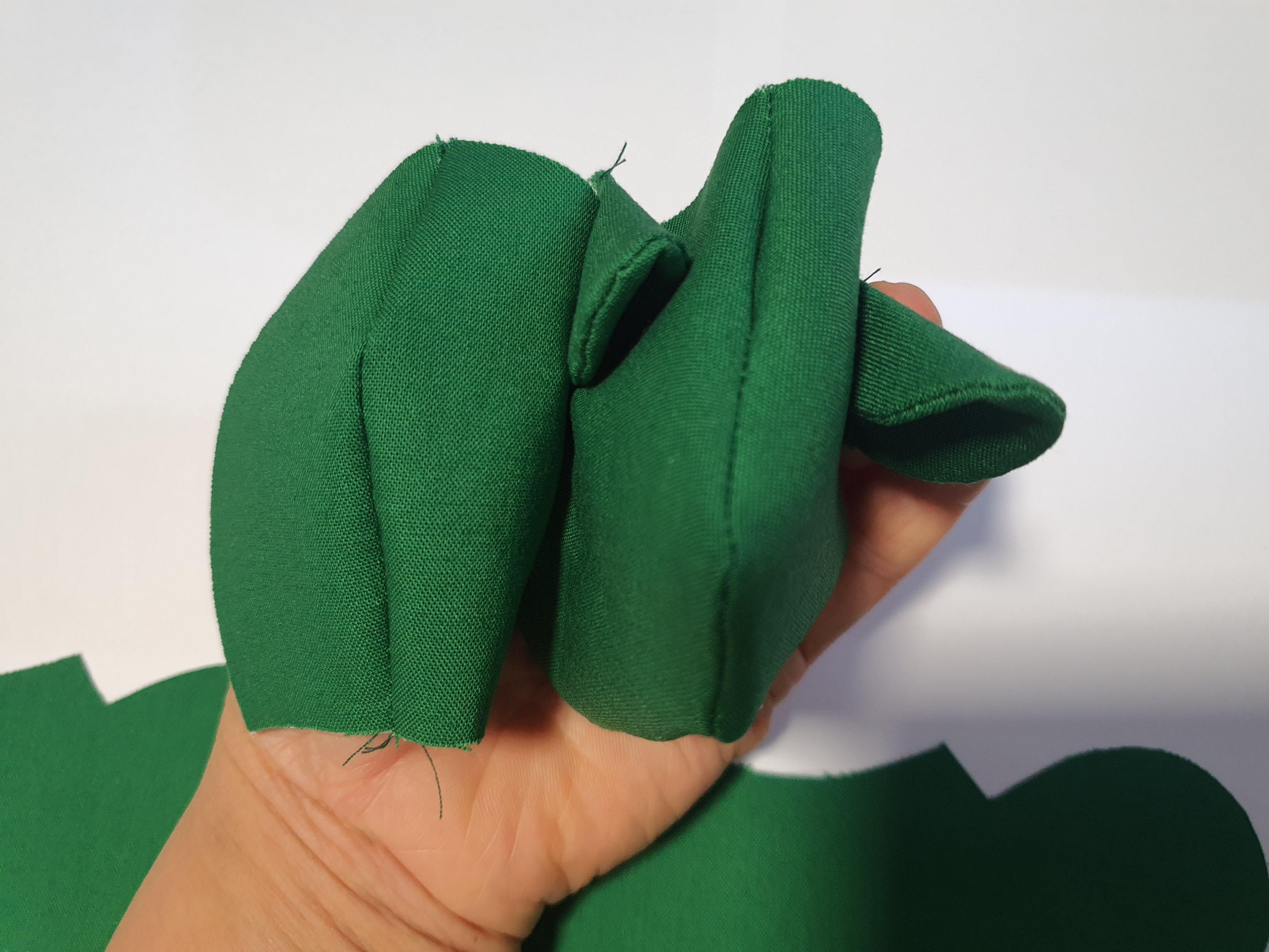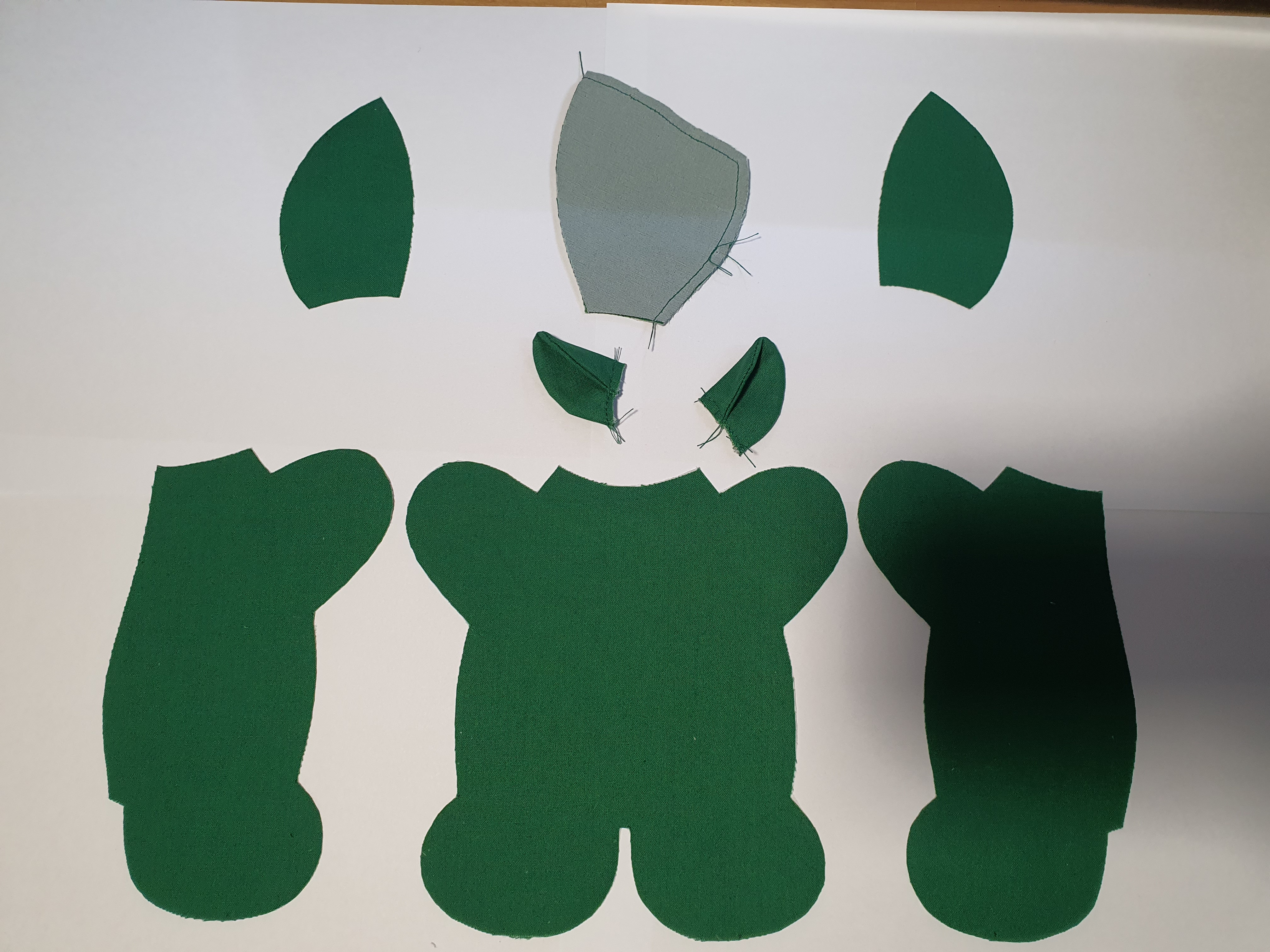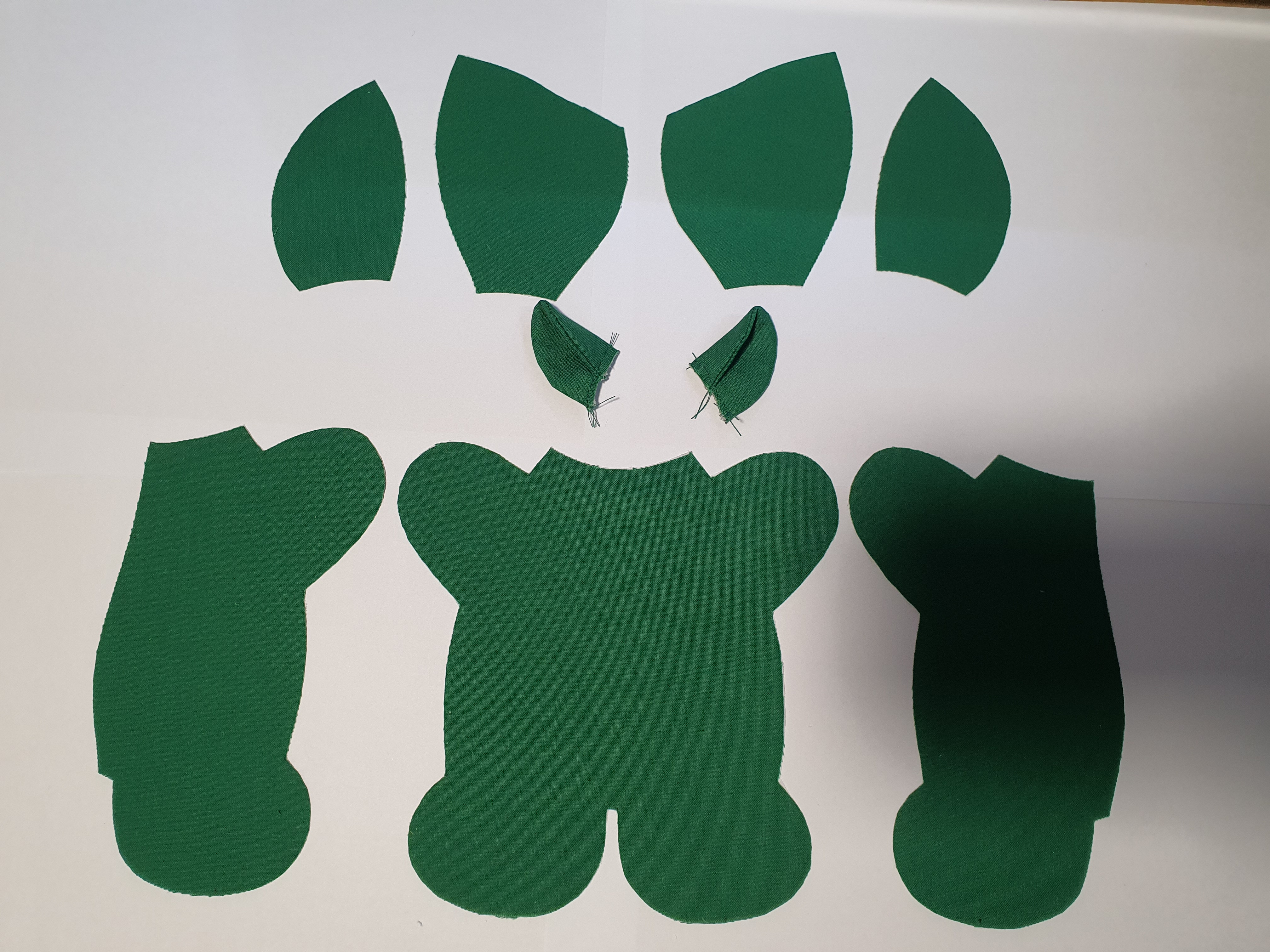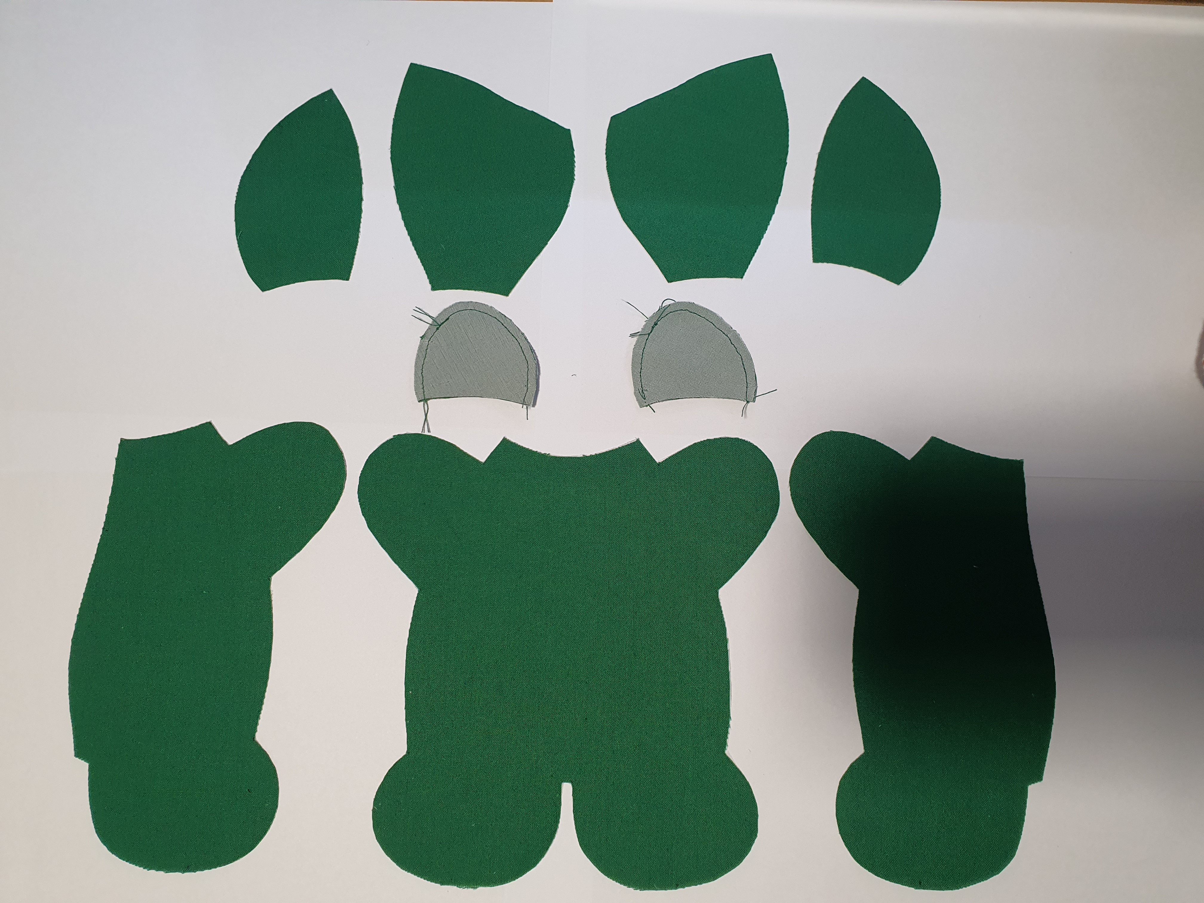 접힌귀가 앞에서 보이도록 끼워 넣고 얼굴 앞 뒤를 바느질 해서 머리를 완성 합니다.