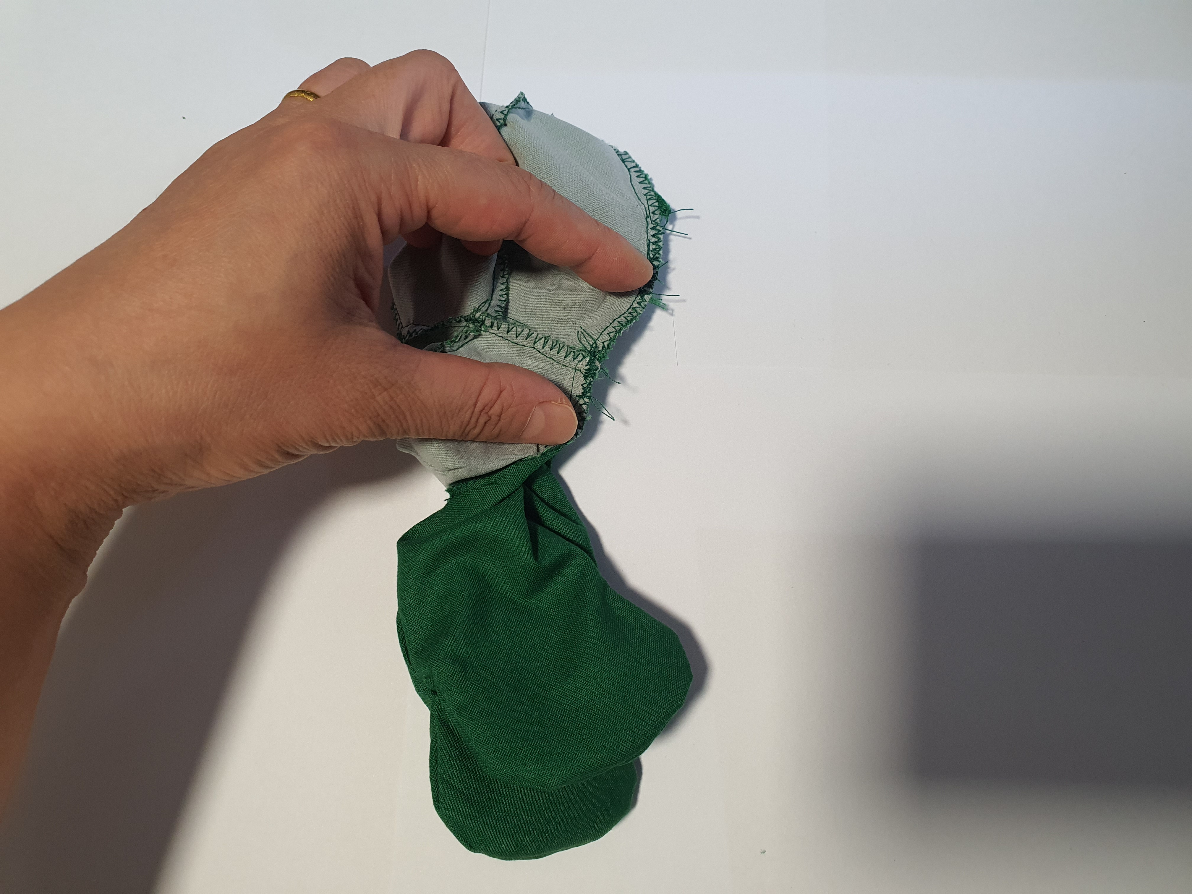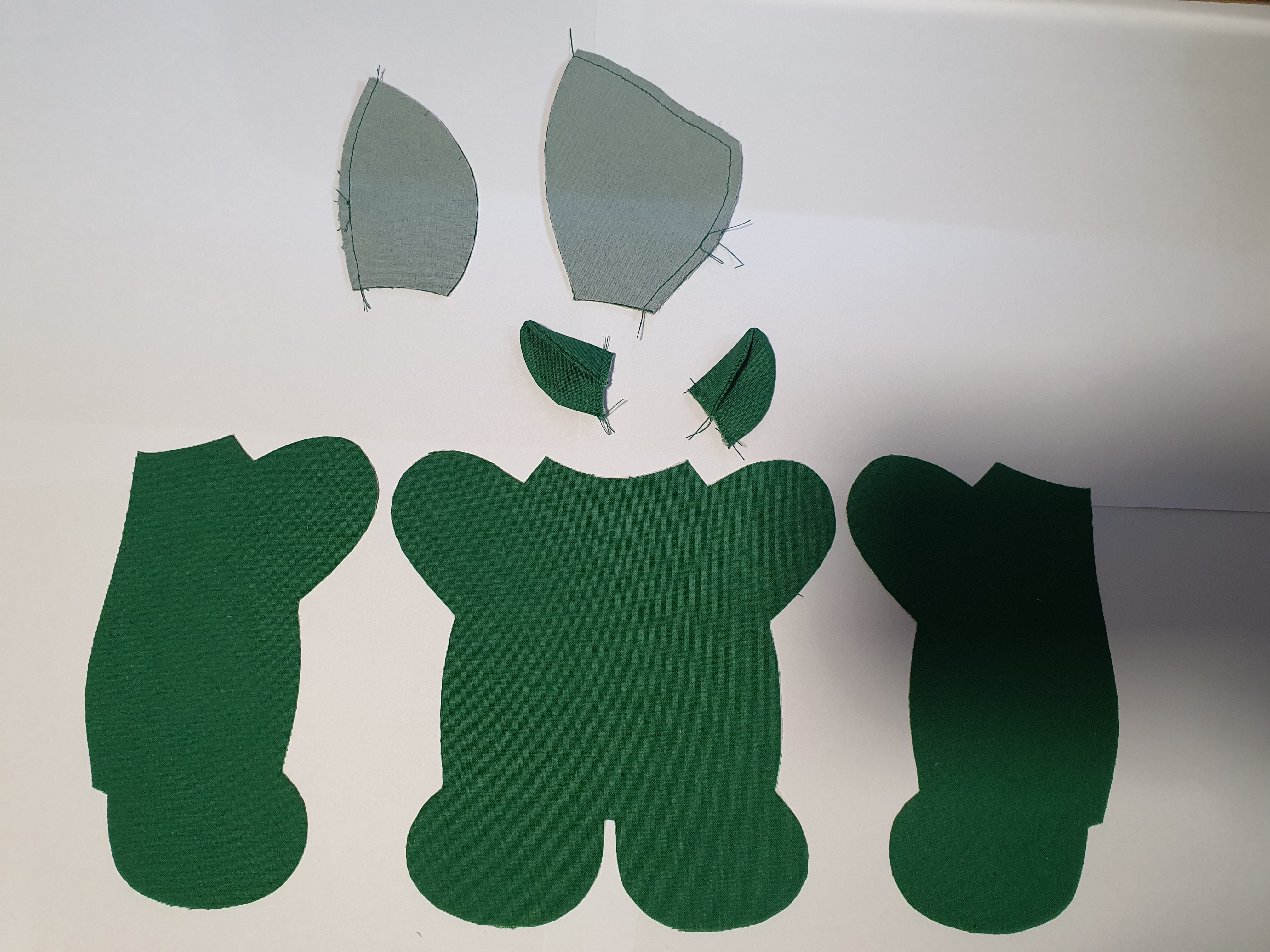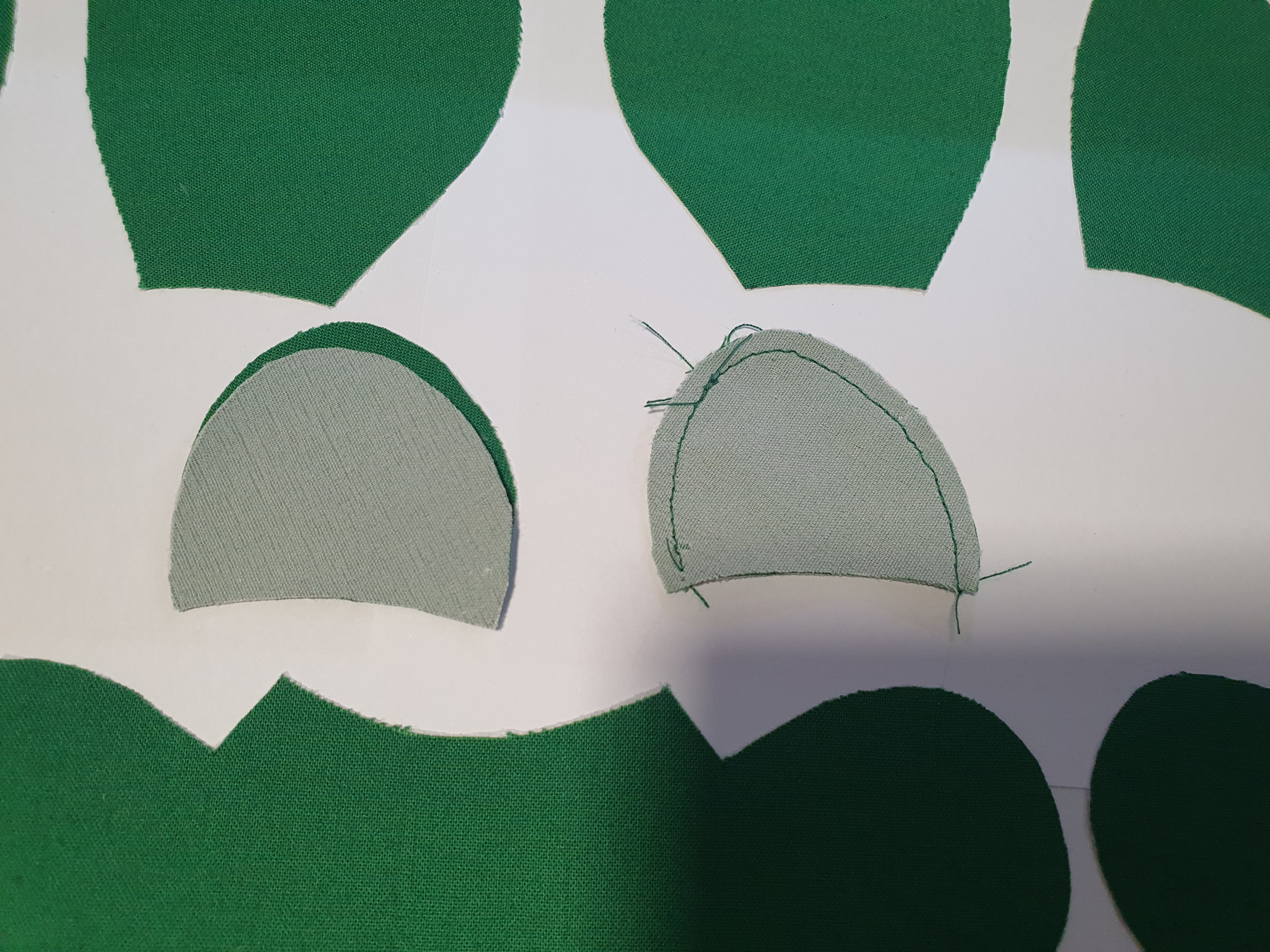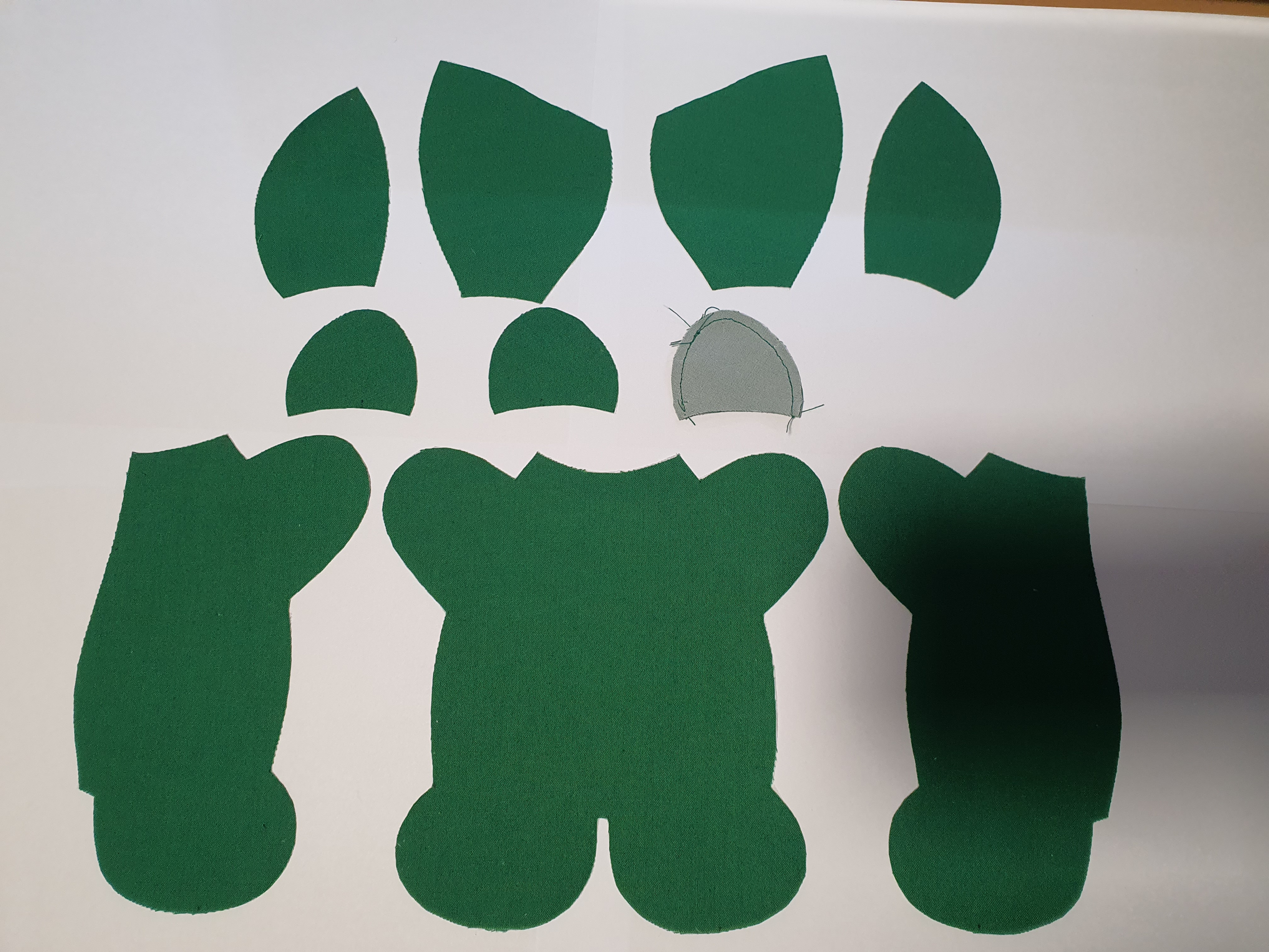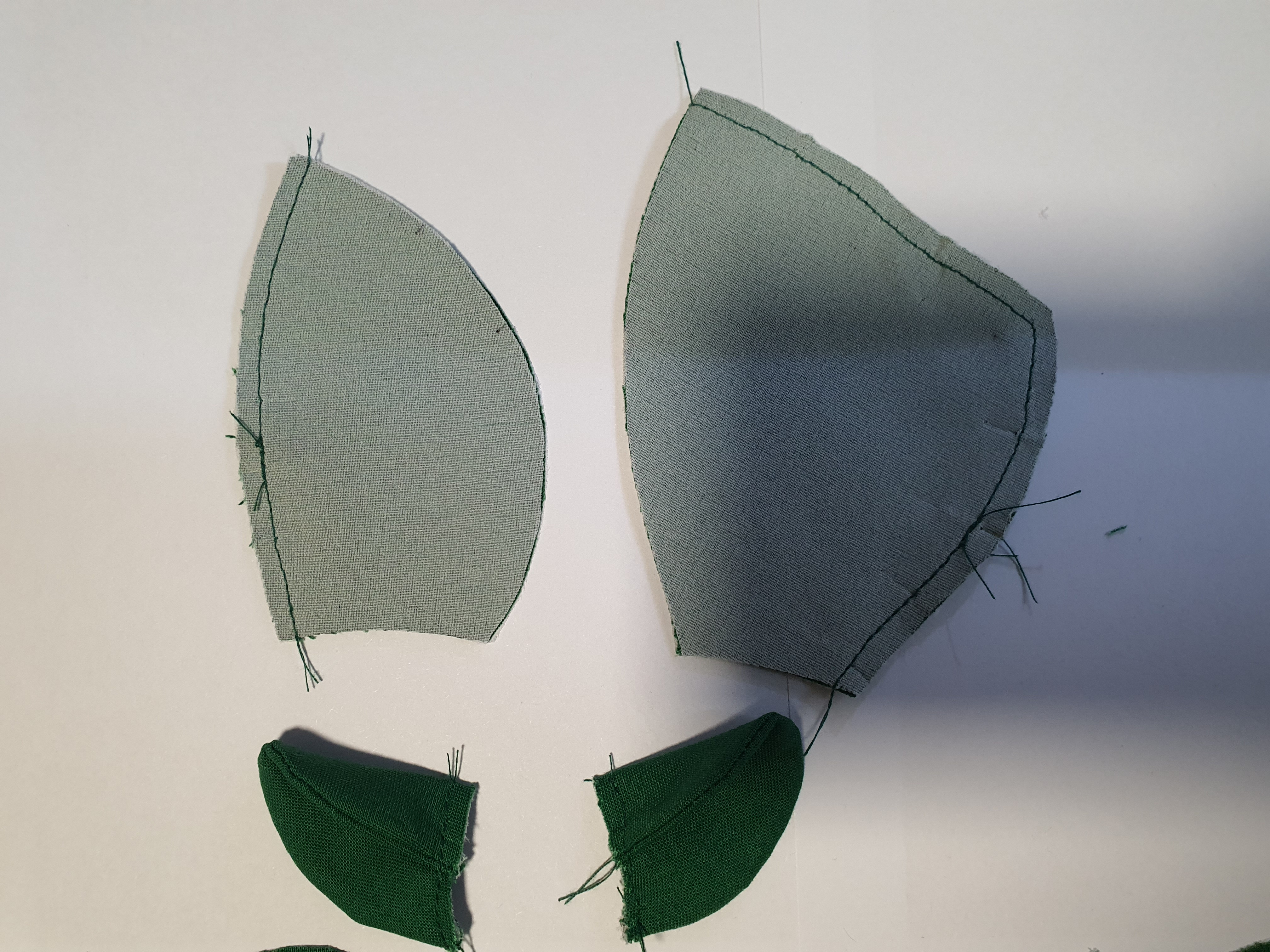 접힌귀가 앞에서 보이도록 끼워 넣고 얼굴 앞 뒤를 바느질 해서 머리를 완성 합니다.