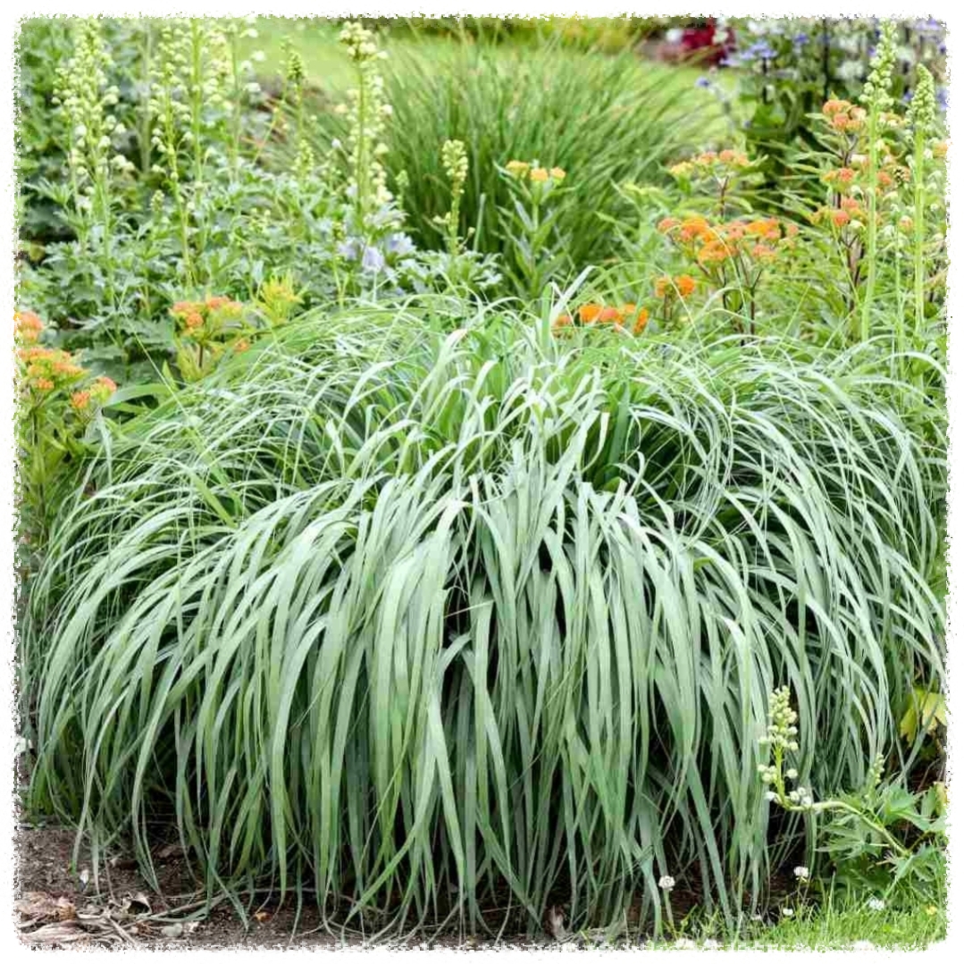 청록/스틸 블루빛 잎이 위로 곧게 직립하며 자라고, 가을에는 황금빛 씨 이삭이 올라와 계절감을 줍니다.